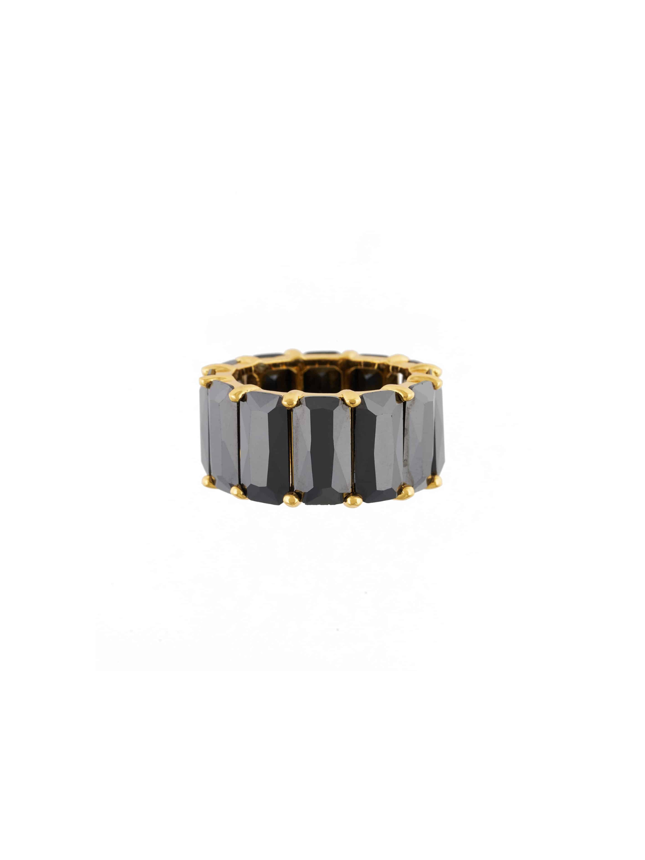 Acompaña tu outfit con los cristales del Anillo Gran Baguette Onix, elaborado en bronce con aleación de plata y baño de oro de 18K.