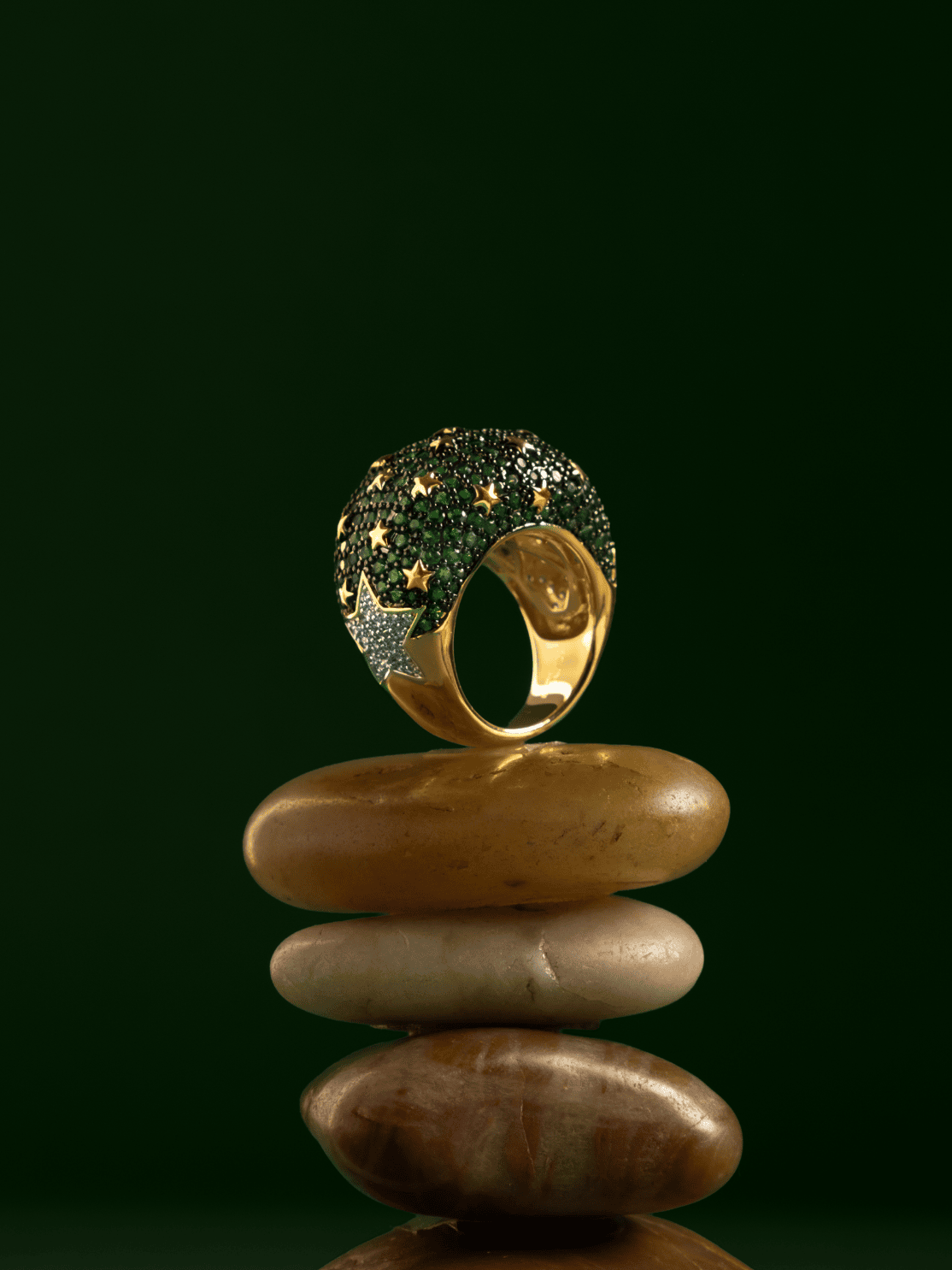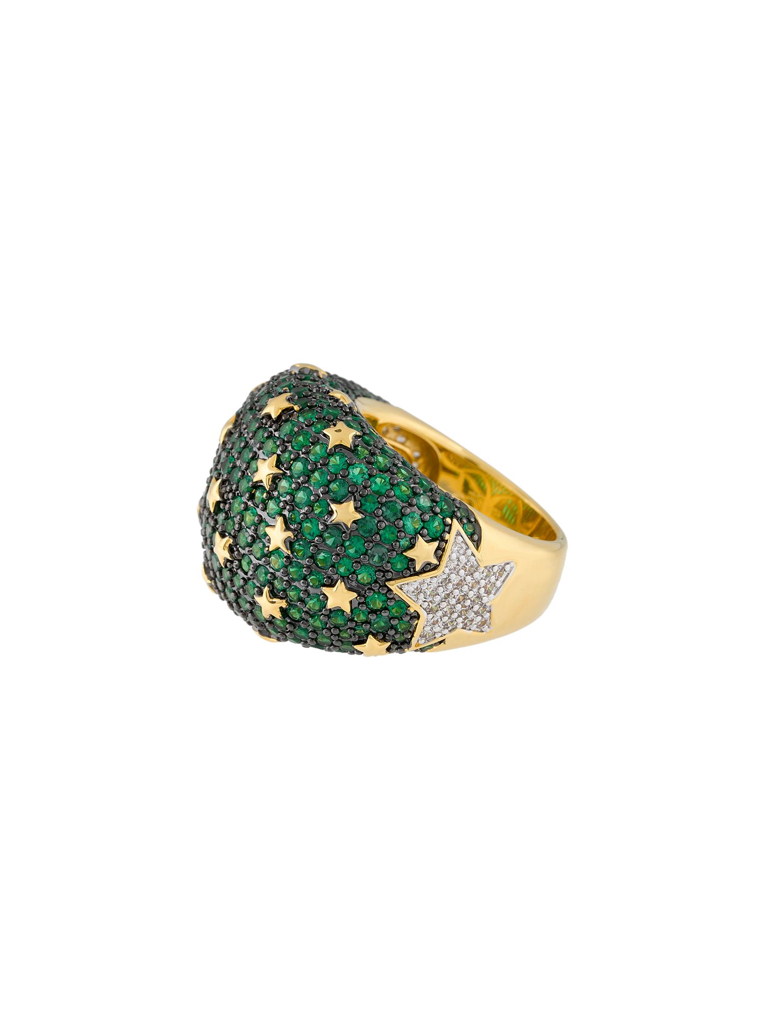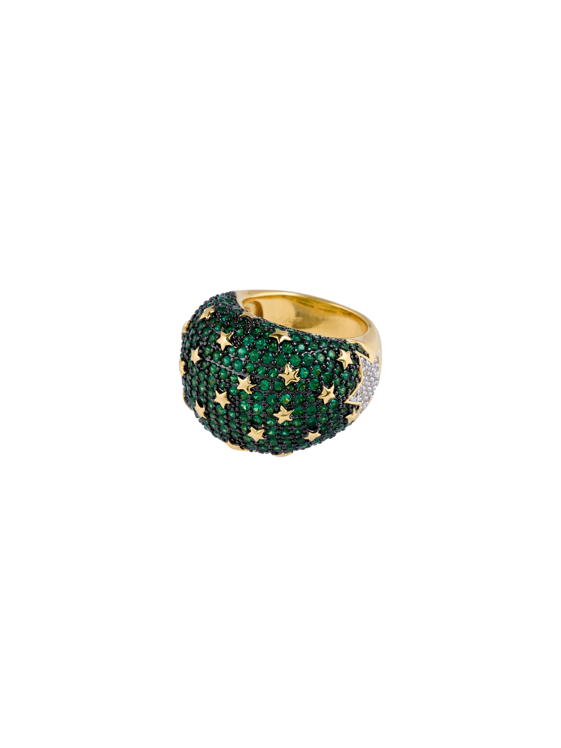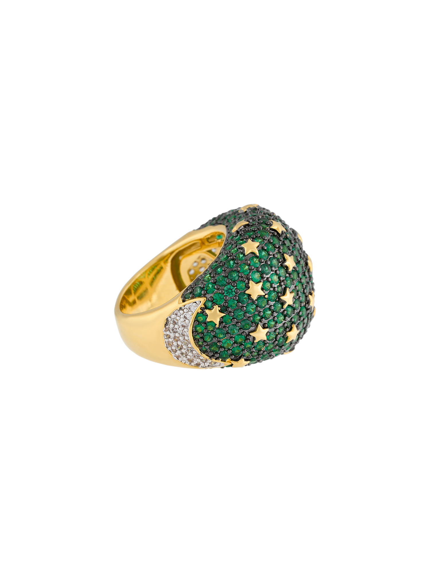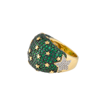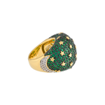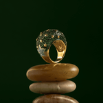 El Anillo Sabah de la Colección Kosmos irradia una energía cósmica que fusiona elegancia y misterio. Su poderoso diseño, bañado en oro y adornado con un cautivador pavé de microcristales verde esmeralda, evoca la profundidad de las galaxias. Pequeñas estrellas doradas emergen entre los cristales, creando un juego de luces que simboliza la conexión entre la tierra y el cosmos.