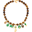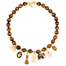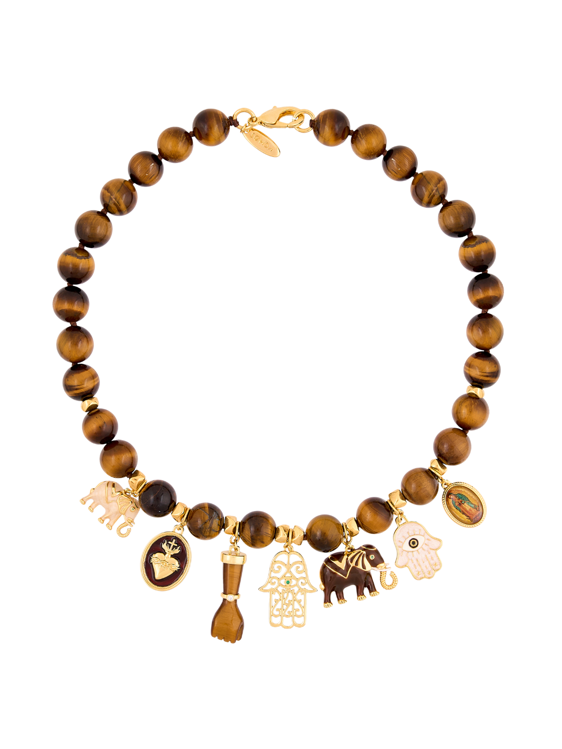 Elaborado en piedra natural Ojo de Tigre y adornado con dijes en plata y bronce con baño en oro de 18 kilates y técnica de esmaltado chocolate y nácar.