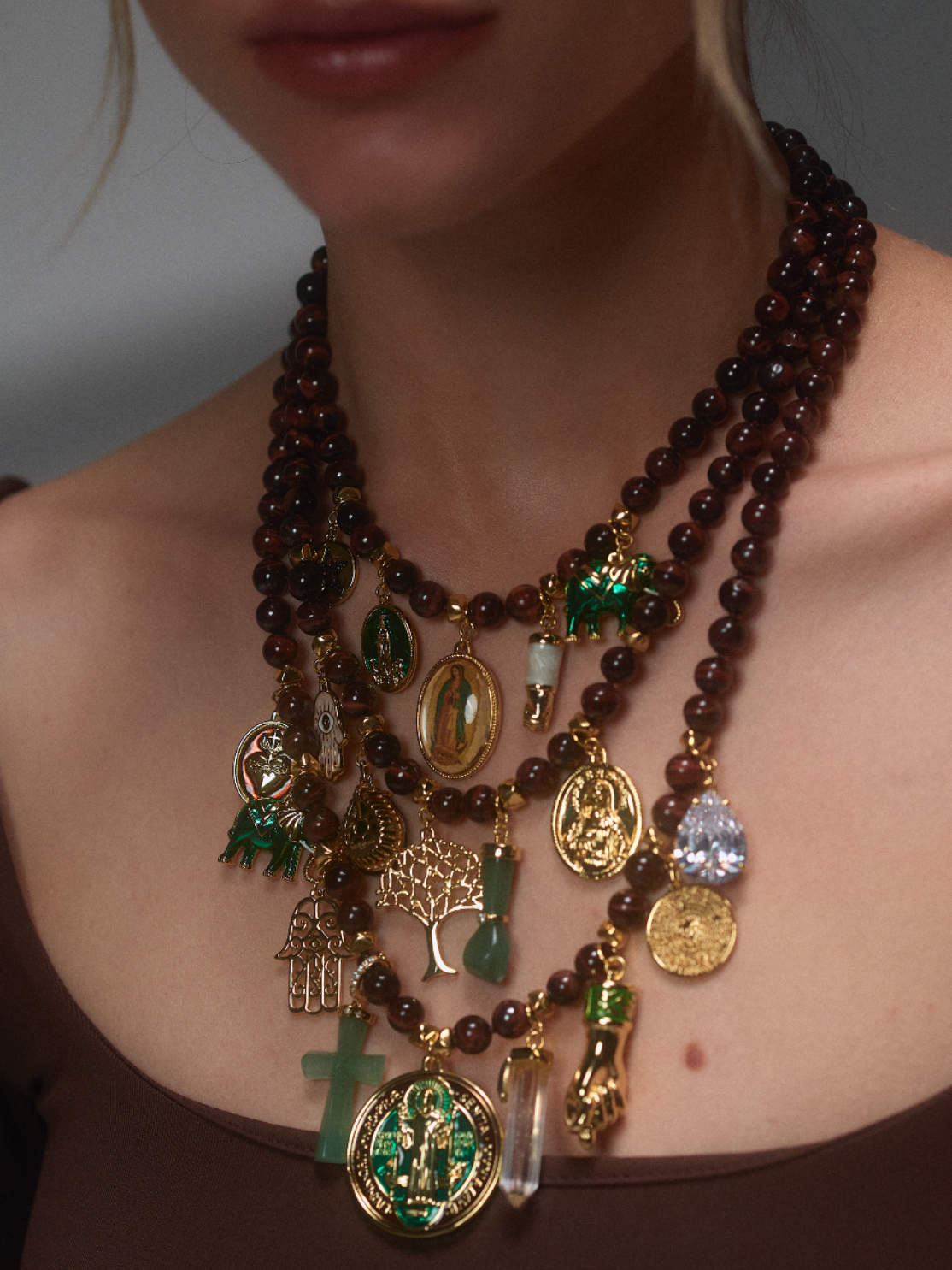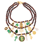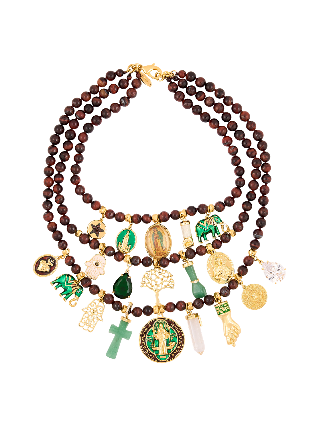 Diseñado con tres hileras de piedras naturales y detalles dorados, este collar reúne amuletos icónicos como la Virgen de Fátima y la medalla de San Benito, entre otras cruces y medallas espirituales, que evocan equilibrio, sabiduría y fortaleza interior.