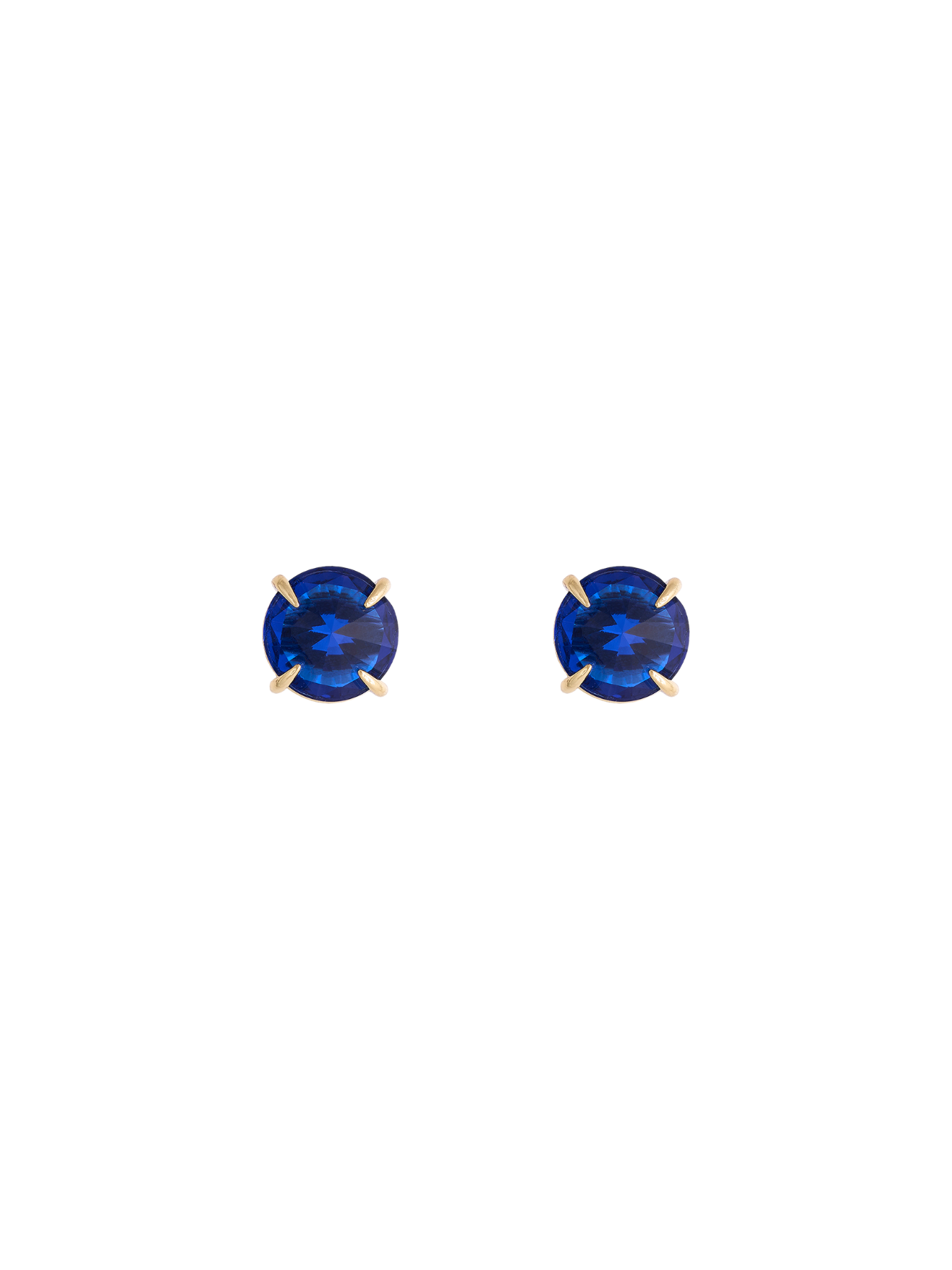 Los Topos Cónico Zafiro están elaborados en una mezcla de plata y bronce con baño en oro de 18 kilates, y adornados con un cristal facetado de 10 mm diámetro en tono zafiro incrustado en una base con un detalle de estrella calada en el metal. Pines y mariposas en plata de ley 925.