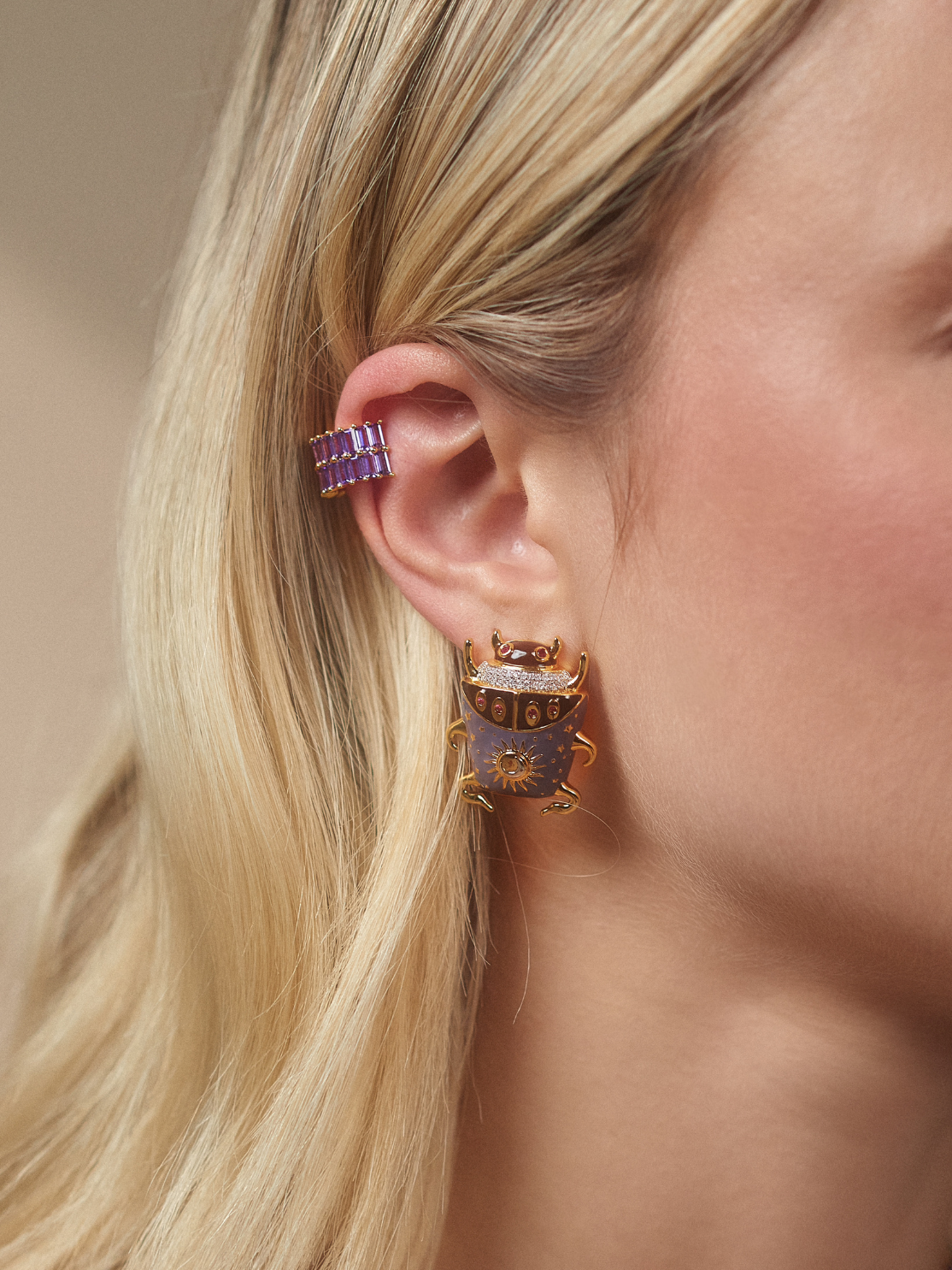 Los Topos Escarabajo Noon de nuestra nueva colección Cycle - inspirada en el movimiento constante que da forma a la materia, el tiempo y la energía- tienen un diseño sofisticado protagonizado por el escarabajo, símbolo de poder vital y orden cósmico. Estos aretes representan equilibrio, fuerza interior y conciencia plena. Sus contrastes de color y detalles luminosos evocan el sol en su punto más alto, fusionando el diseño contemporáneo y el simbolismo con mucho estilo.