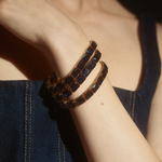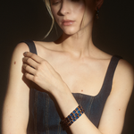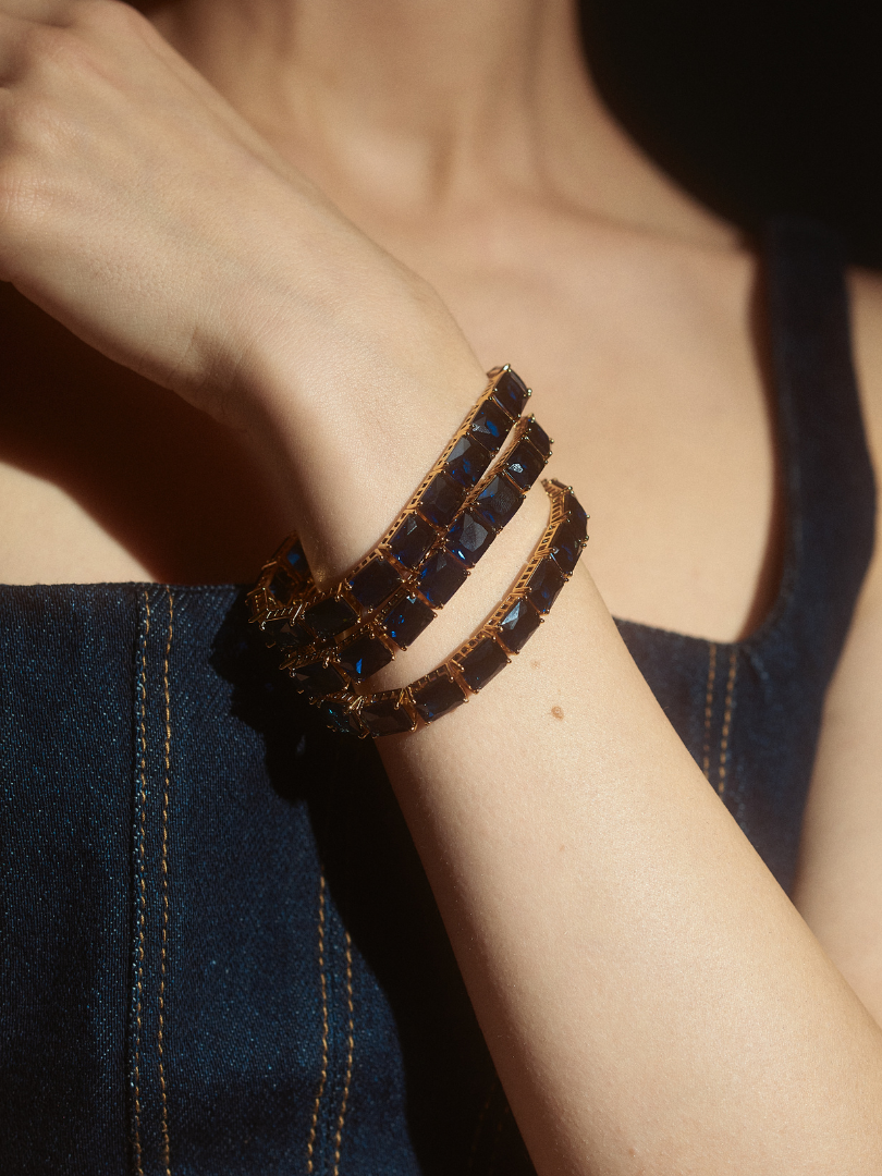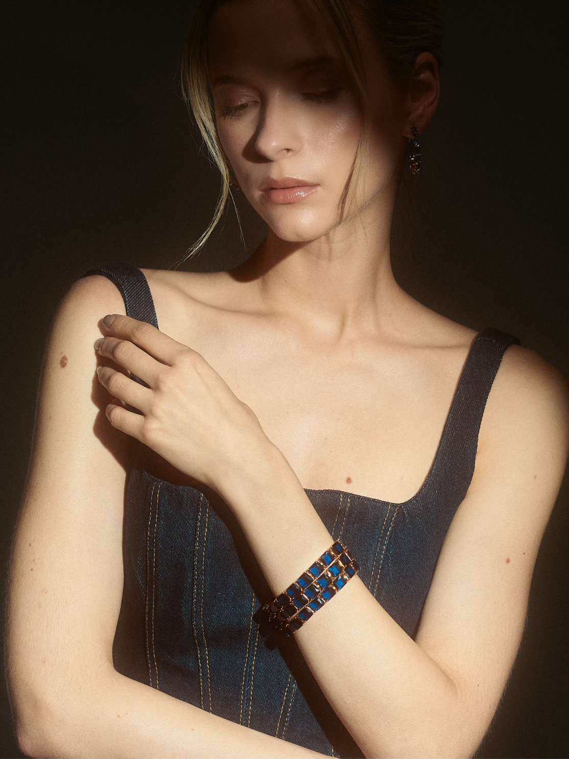 Diseñada con cristales azules de corte geométrico y una base dorada, esta pulsera expresa equilibrio, fuerza vital y orden cósmico. Su diseño continuo simboliza el ciclo eterno de transformación y renovación. Ideal para elevar looks sofisticados y contemporáneos, el brazalete Noon es una declaración de lujo moderno, elegancia y significado.