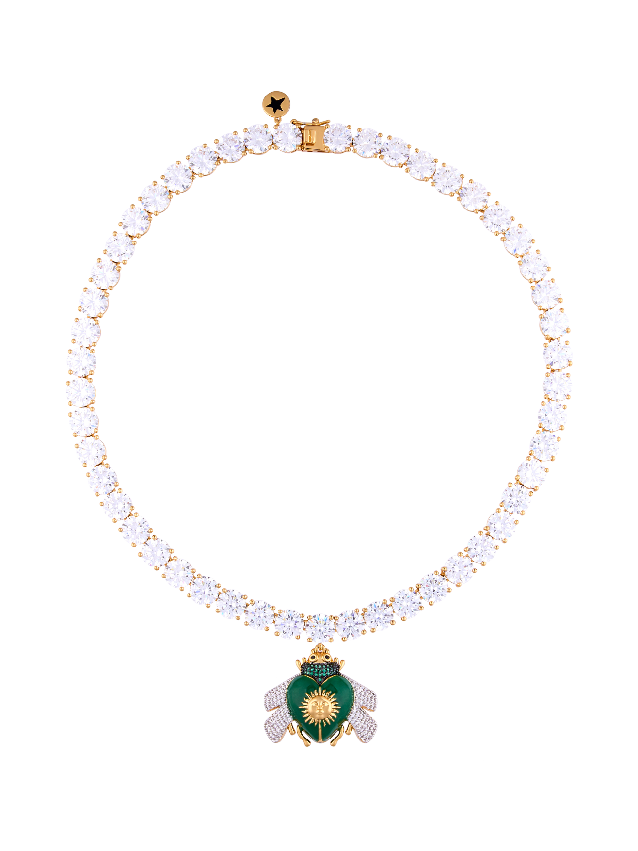 Elaborada en bronce con baño en oro de 18k, cristales facetados de 8 mm y broche seguro con charm de estrella esmaltada. El dije de abeja incluye esmalte verde y microcristales en tonos esmeralda, ónix y cristal.