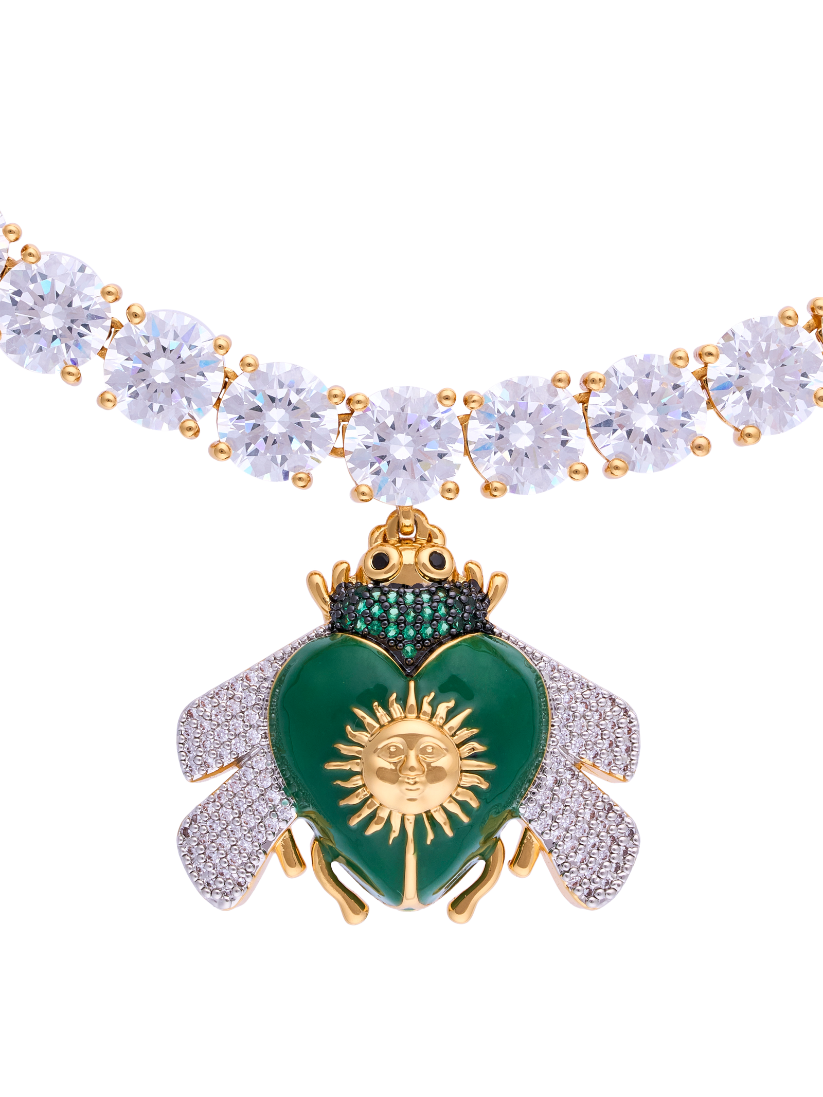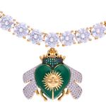 Su cadena tipo tennis con cristales brillantes crea una línea continua de luz, mientras que el delicado dije de abeja con cuerpo verde intenso, sol dorado y alas pavé de microcristales aporta brillo, significado y elegancia.