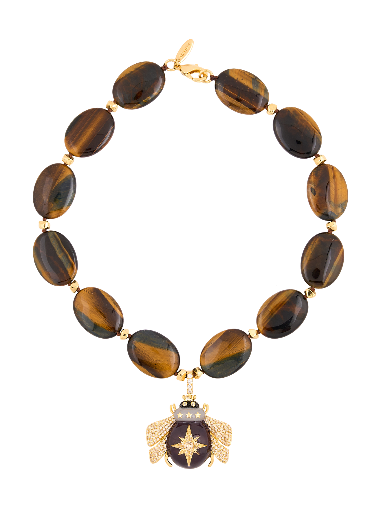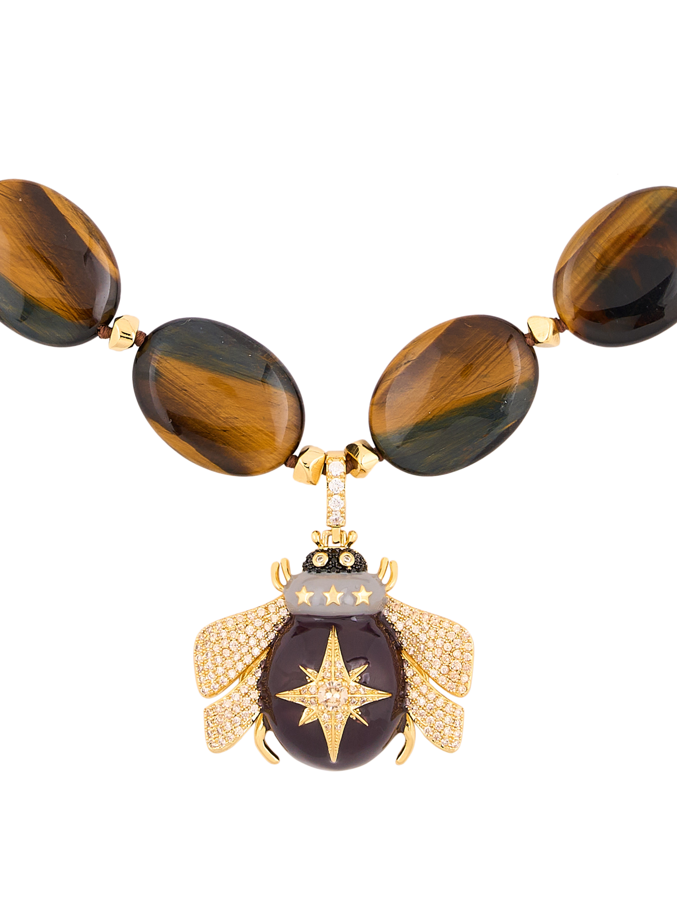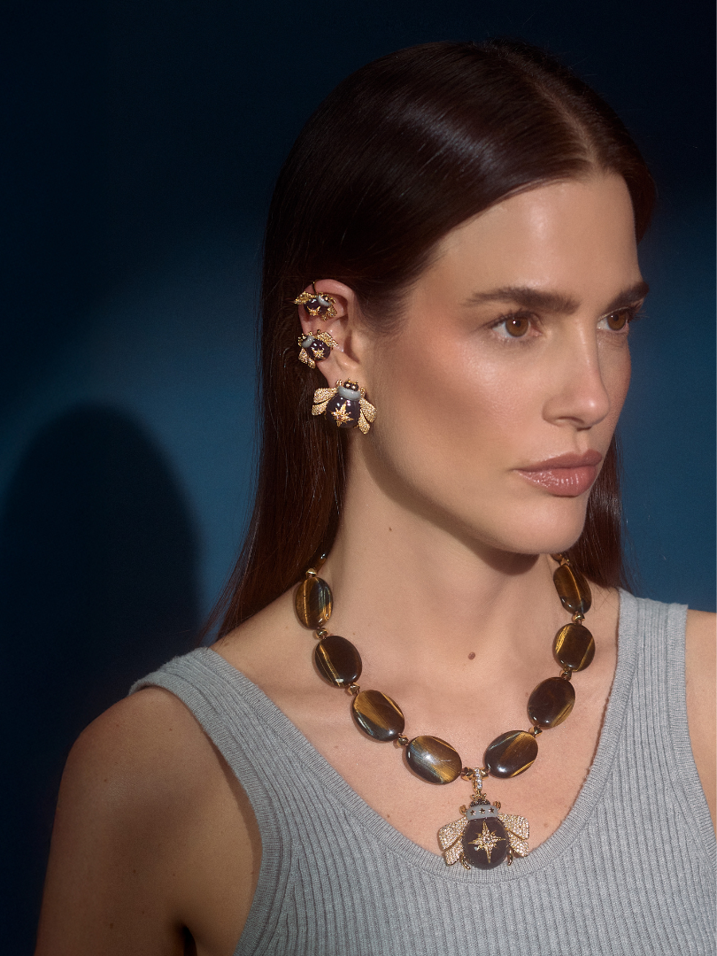 La abeja, símbolo ancestral de comunidad, enfoque y prosperidad, se fusiona con la energía protectora del ojo de tigre, dando vida a una joya que trasciende lo ornamental para convertirse en un talismán moderno.