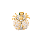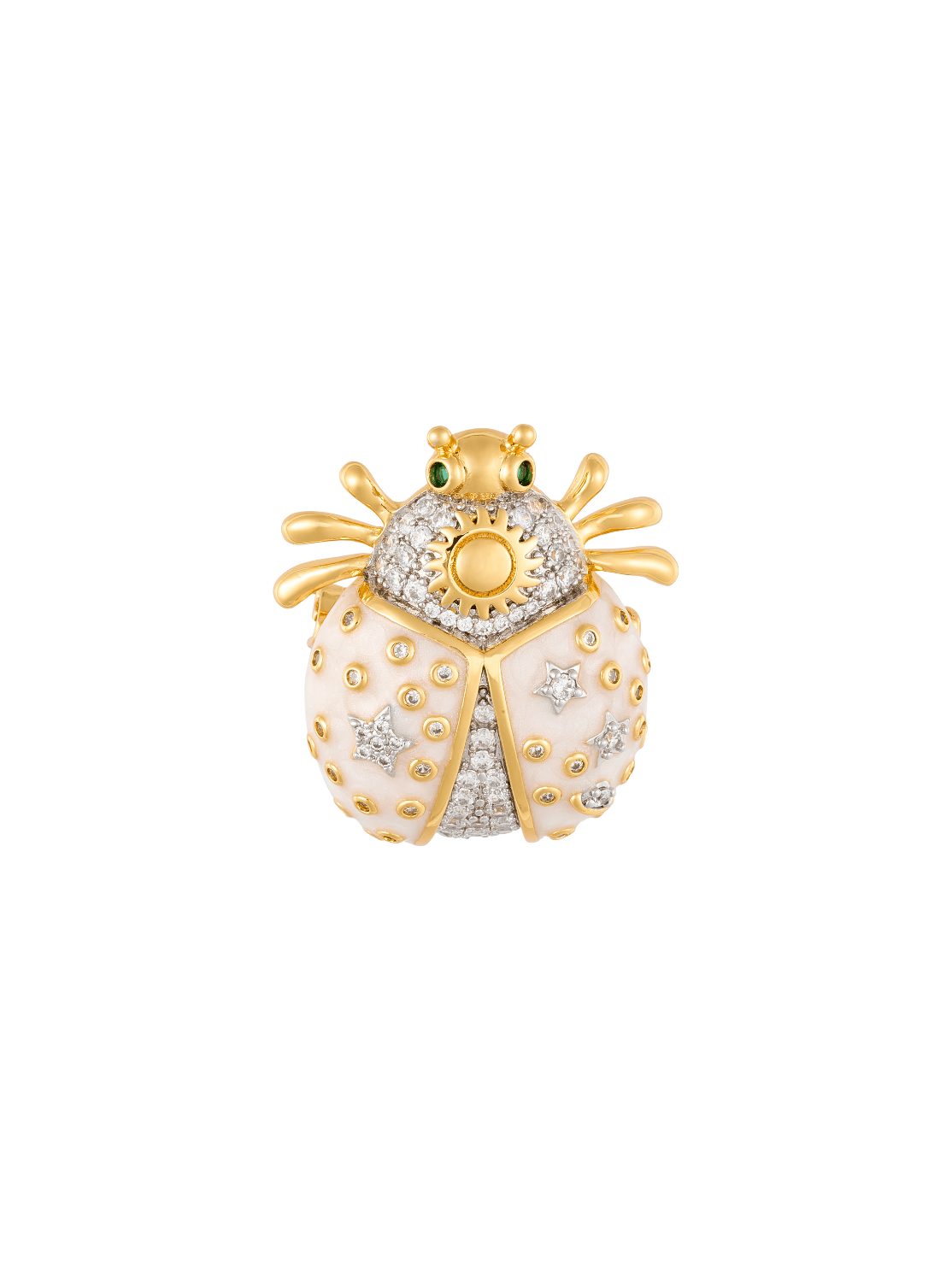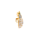 El Broche Royal Thot Nácar, es una joya que fusiona la delicadeza del bronce con un magnífico baño de oro de 18 kilates y rodio blanco. Sus cristales translúcidos destellan su magia con la luz y los esmeralda aportan el toque perfecto de color, mientras el esmalte en un cautivador tono nácar da un toque de delicadeza y distinción.