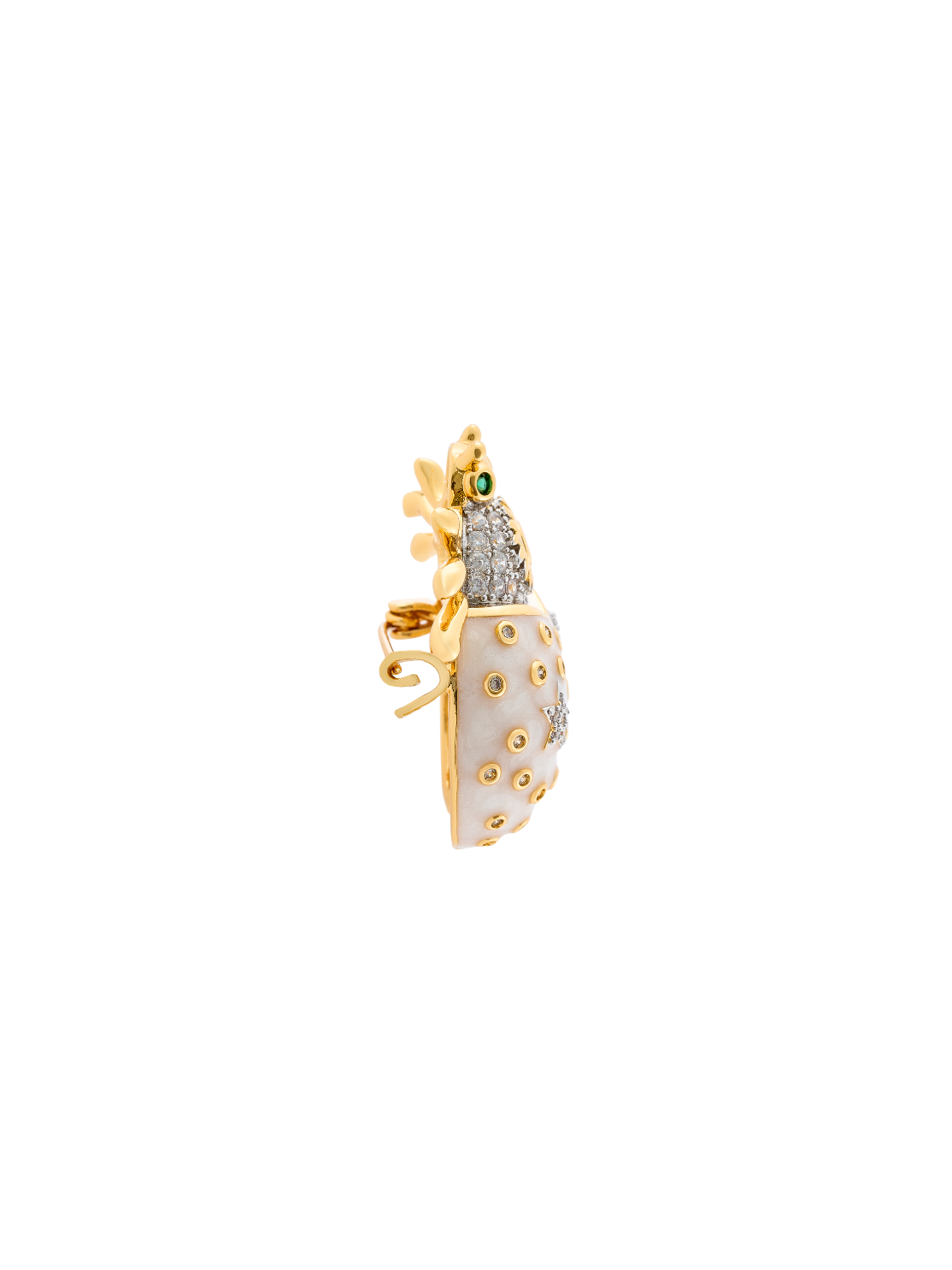 Elaborado en metal bronce, con baño de oro de 18 kilates, baño de rodio blanco, e incrustación de circones, con detalles en esmaltes selectos.