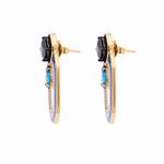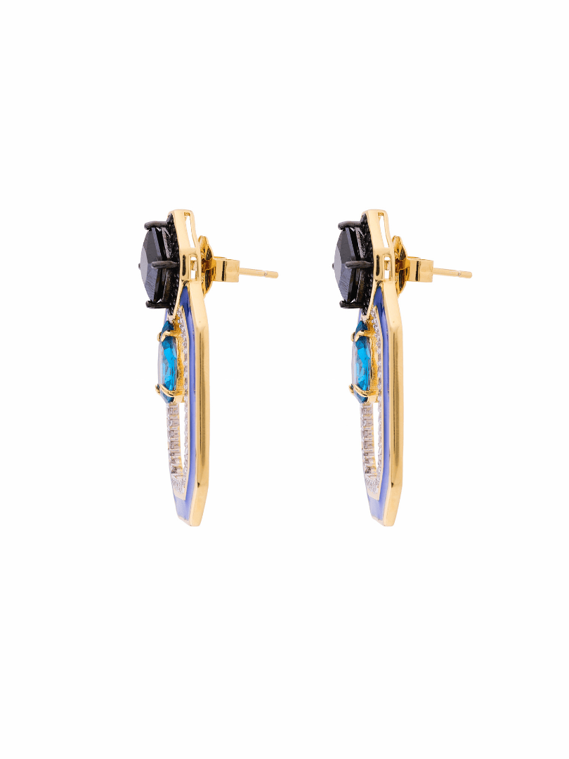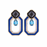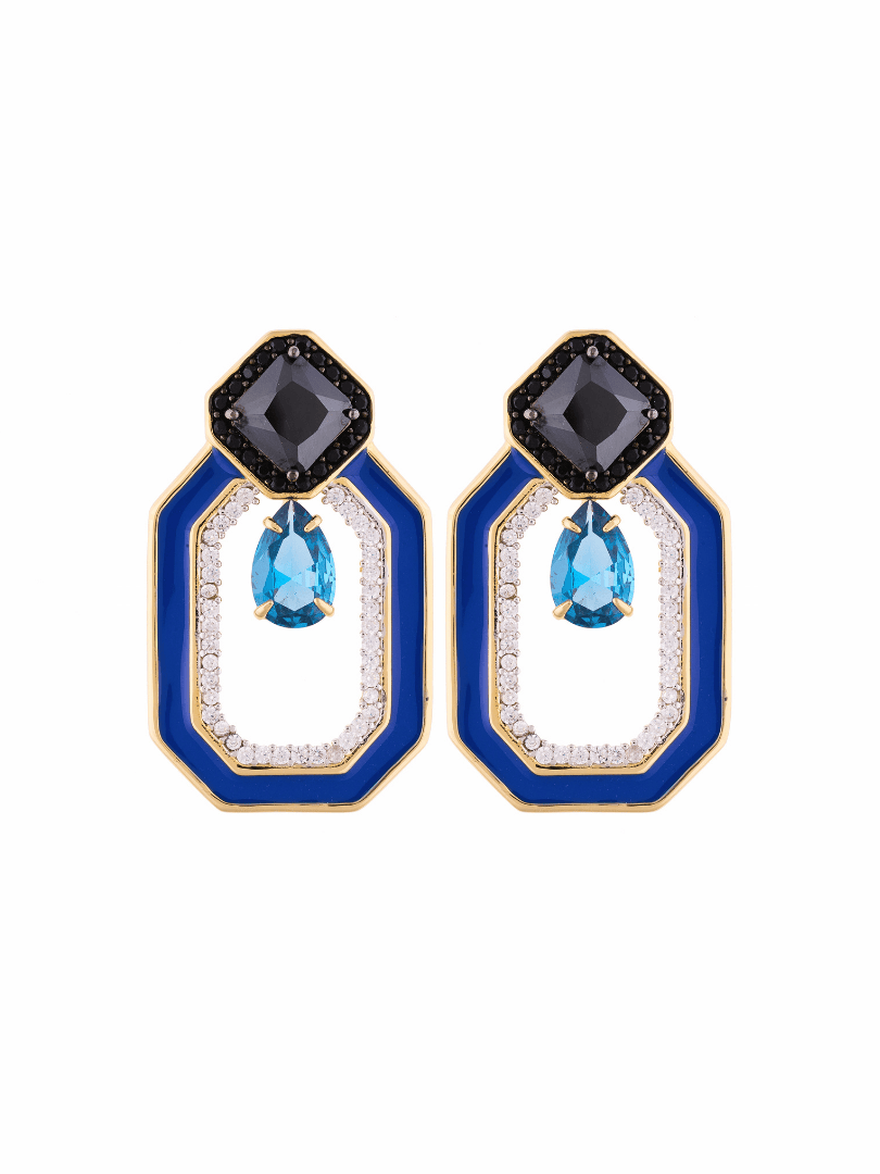 Elaborados en metal bronce con baño de oro de 18 kilates y baño de rodio blanco, adornados con cristales facetados en tonos negro y aqua enmarcados en un octágono irregular con incrustación de microcristales en tono cristal y esmaltado azul.
