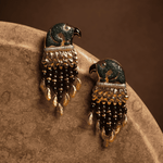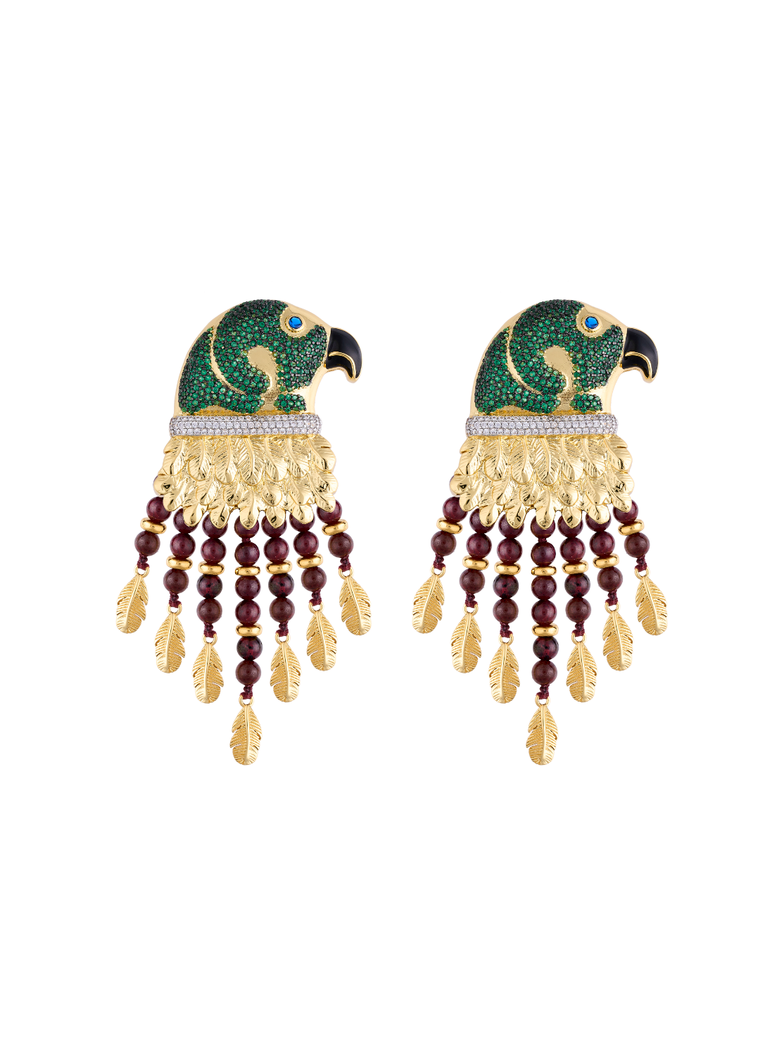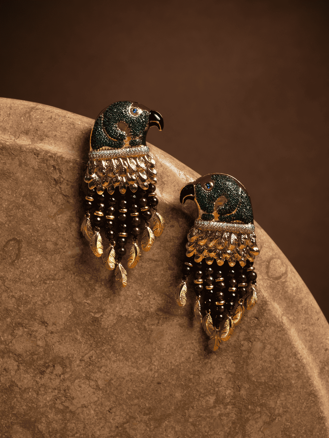 Cada pieza combina un detallado trabajo de incrustación de cristales en tonos verdes y piedras naturales de granate en tono chocolate, con una estructura dorada escultórica que evoca las plumas y el movimiento natural del ave.
