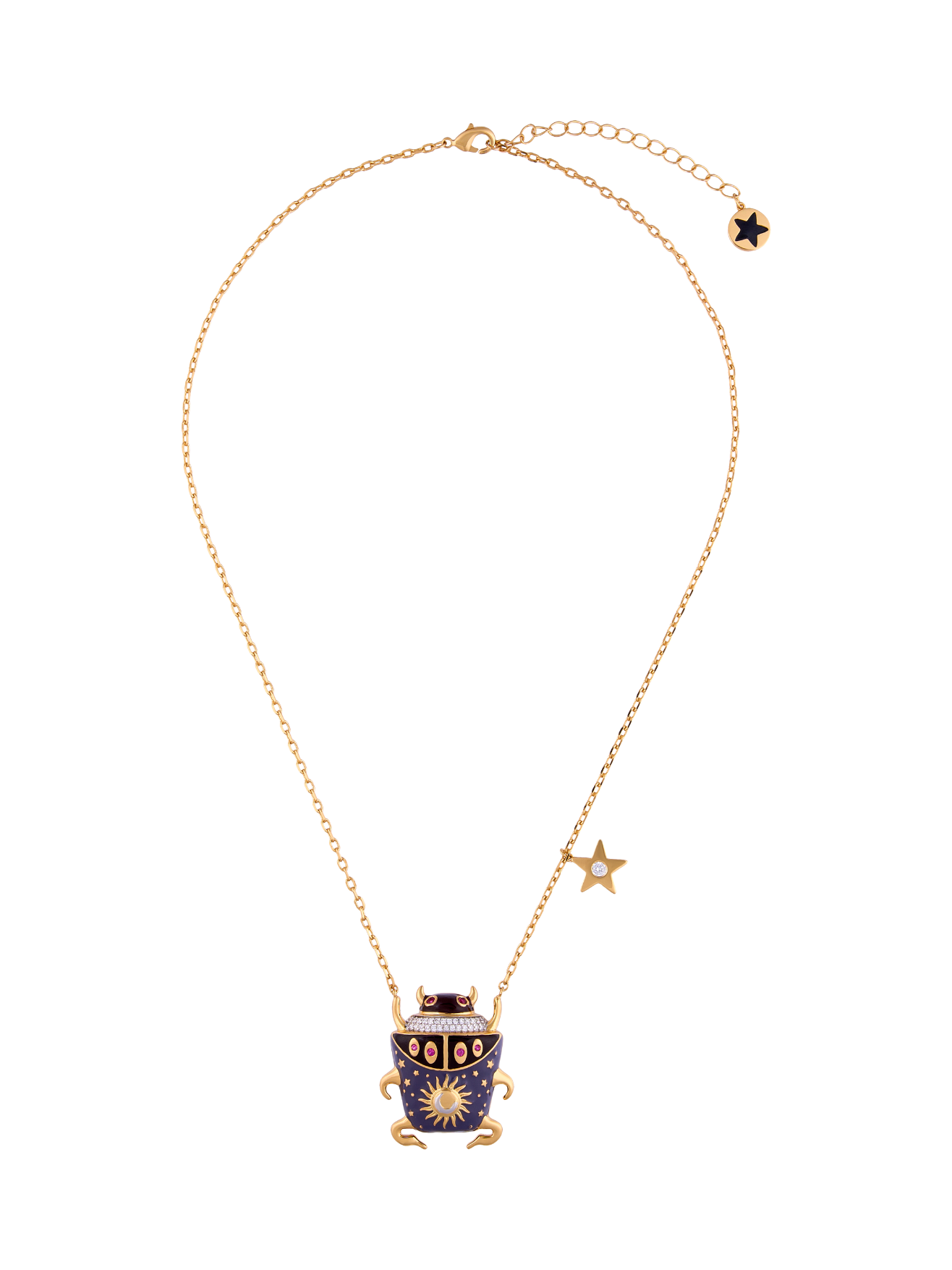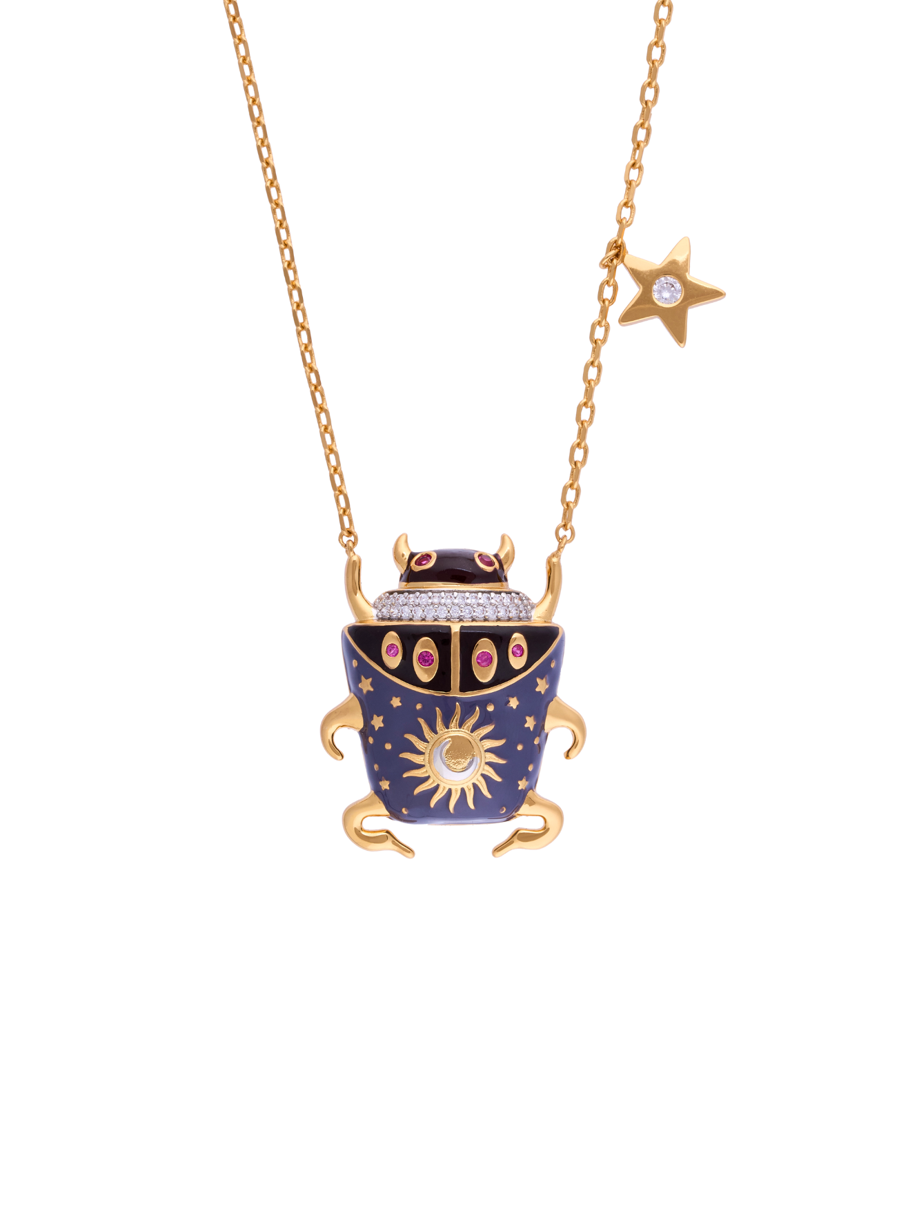 El escarabajo, concebido como amuleto, simboliza poder vital, protección y orden cósmico. Su diseño escultórico se realza con detalles luminosos que evocan el sol en su punto más alto, convirtiendo el collar en una joya cargada de intención y significado.