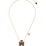 Cadena de clips en plata de ley 925 con baño de oro de 18 kilates y detalle de estrella adornada con un cristal facetado en tono cristal. Dije elaborado en metal bronce con baño en oro de 18 kilates y baño de rodio, y adornado con microcristales en tono rubí y cristal. Técnica de esmaltado en diferentes tonos de morado. Placa con logo con detalle de estrella en esmalte negro.