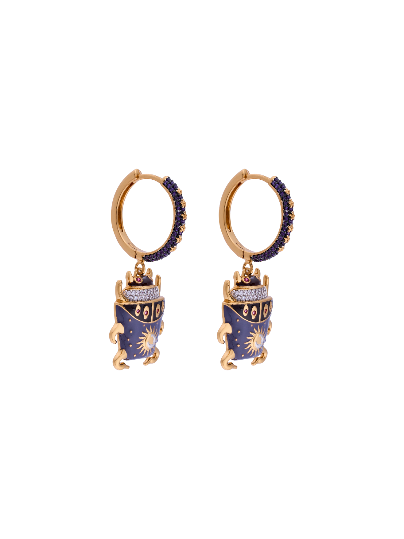 El escarabajo, concebido como amuleto de protección y poder vital, se integra a la silueta clásica de la candonga con un diseño escultórico y sofisticado. Sus detalles luminosos evocan el sol en plenitud, creando una pieza de joyería contemporánea que fusiona simbolismo, elegancia y carácter.