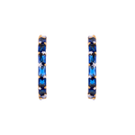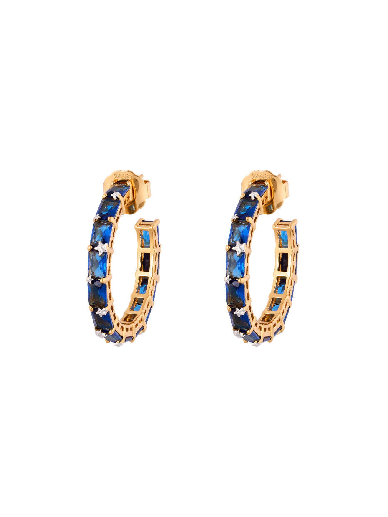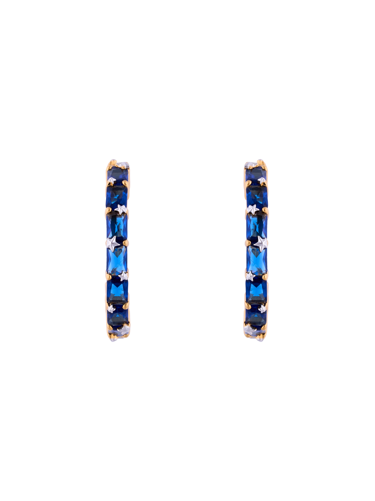 Elaboradas en metal bronce con baño de oro de 18 kilates, y adornados con cristales facetados en corte baguette de tono zafiro y detalles de estrellas bañadas en rodio. Pines y mariposa elaborados en plata de ley 925.