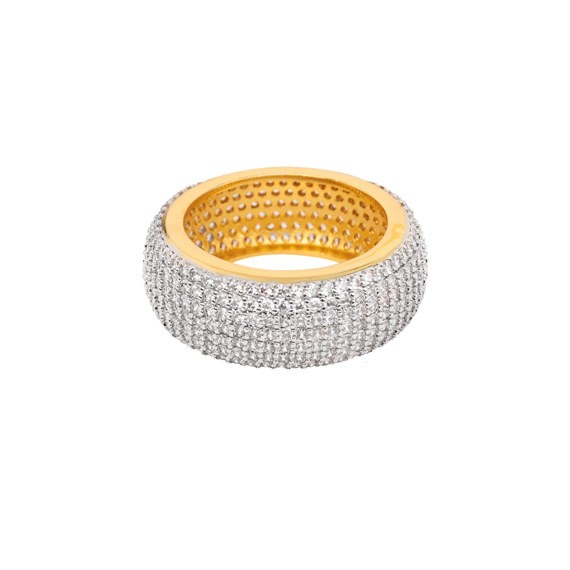 Este anillo chunky está elaborado en bronce con baño en oro de 18 kilates y baño en rodio, y cubierto de microcristales en pavé en tono cristal.