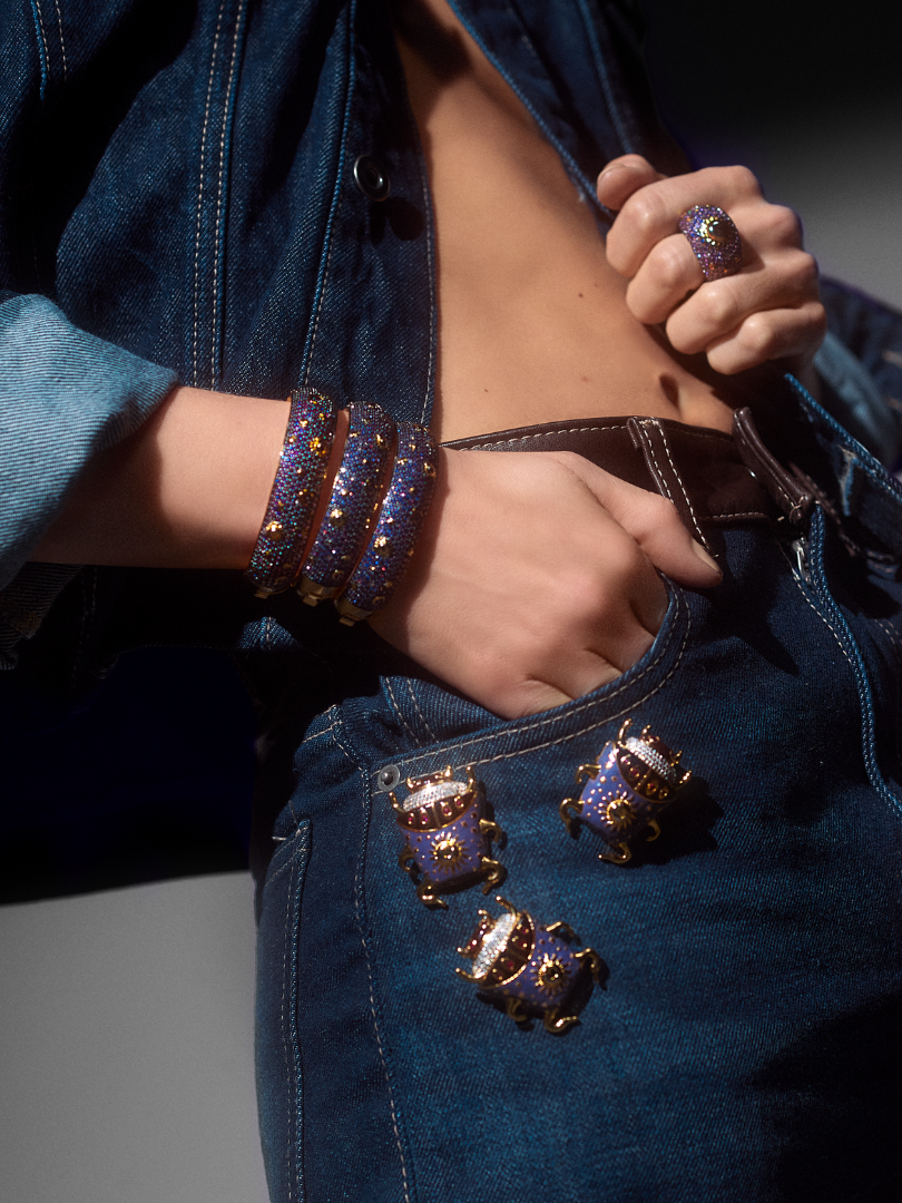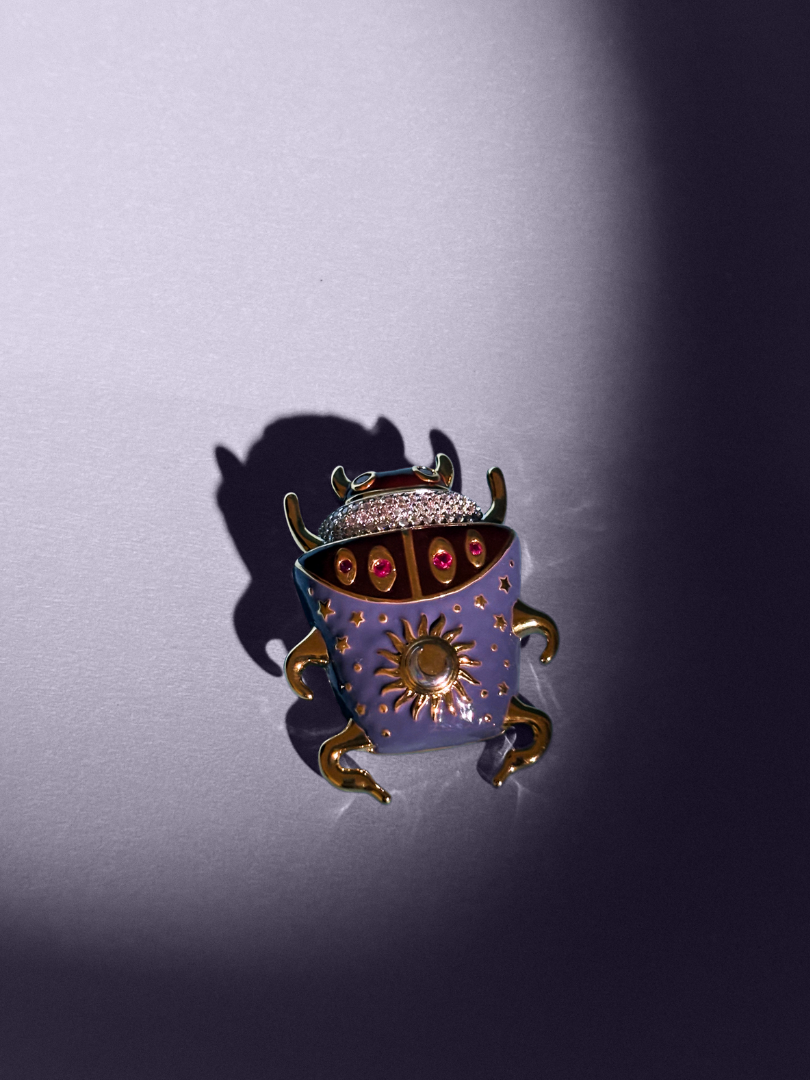 El Broche Escarabajo Noon Morado de nuestra nueva colección Cycle -inspirada en el movimiento continuo que rige la materia, el tiempo y la energía- reinventa el diseño icónico de nuestro escarabajo, símbolo de poder vital, orden cósmico y renovación, combinándose con detalles luminosos que evocan el sol en su punto más alto. Una pieza de joyería contemporánea premium que une simbolismo, sofisticación y carácter.