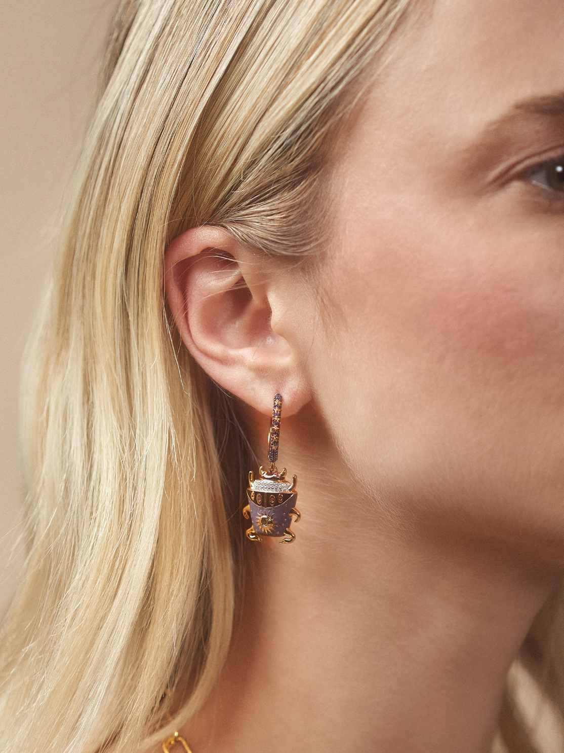 El escarabajo, concebido como amuleto de protección y poder vital, se integra a la silueta clásica de la candonga con un diseño escultórico y sofisticado. Sus detalles luminosos evocan el sol en plenitud, creando una pieza de joyería contemporánea que fusiona simbolismo, elegancia y carácter.