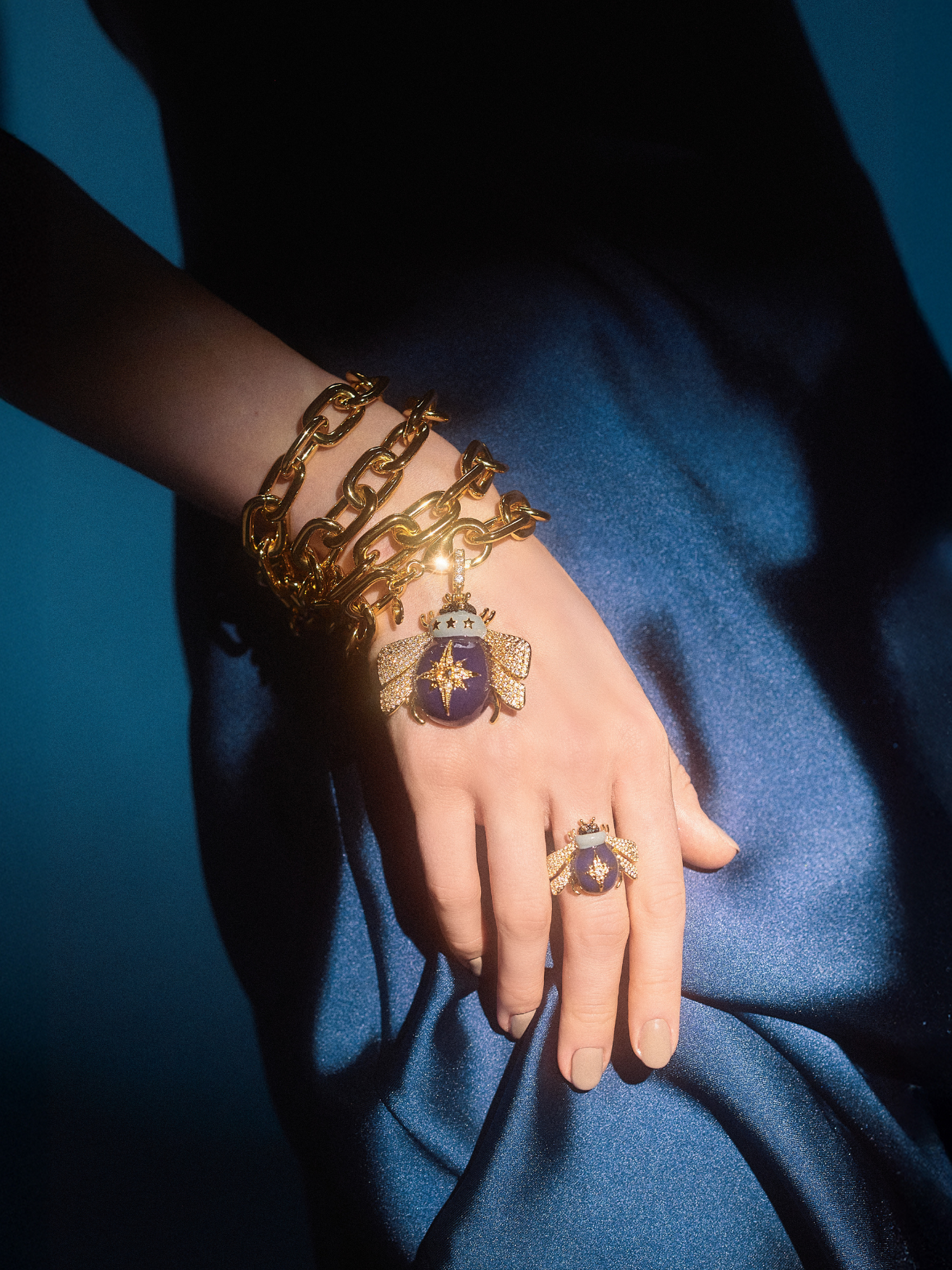 A design full of shine and sweetness that transforms any look. The Candy Bee polka dots, with crystal-pavé wings, an oval central stone, and gold details, evoke the delicacy and energy of nature. A unique accessory for those who love to stand out with a touch of elegance.