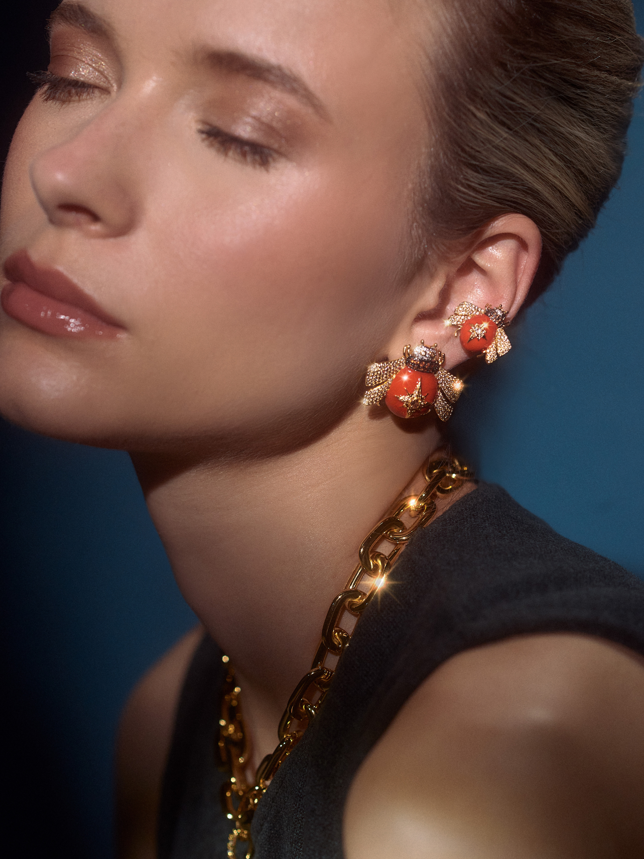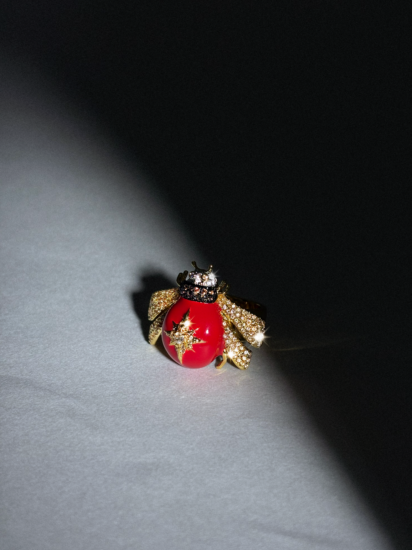 A design full of shine and sweetness that transforms any look. The Candy Bee polka dots, with crystal-pavé wings, an oval central stone, and gold details, evoke the delicacy and energy of nature. A unique accessory for those who love to stand out with a touch of elegance.