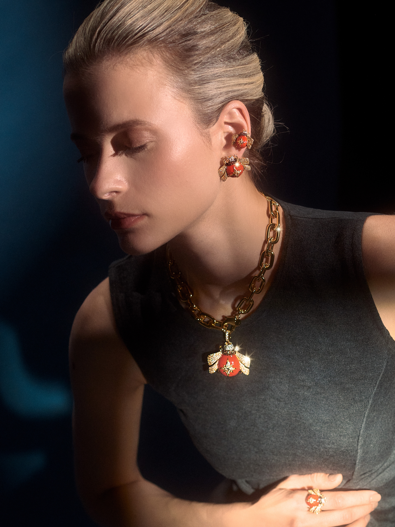 Crafted of bronze metal, with 18-karat gold plating, white rhodium plating, and black rhodium plating, and zircon inlays, with details in select enamels.
