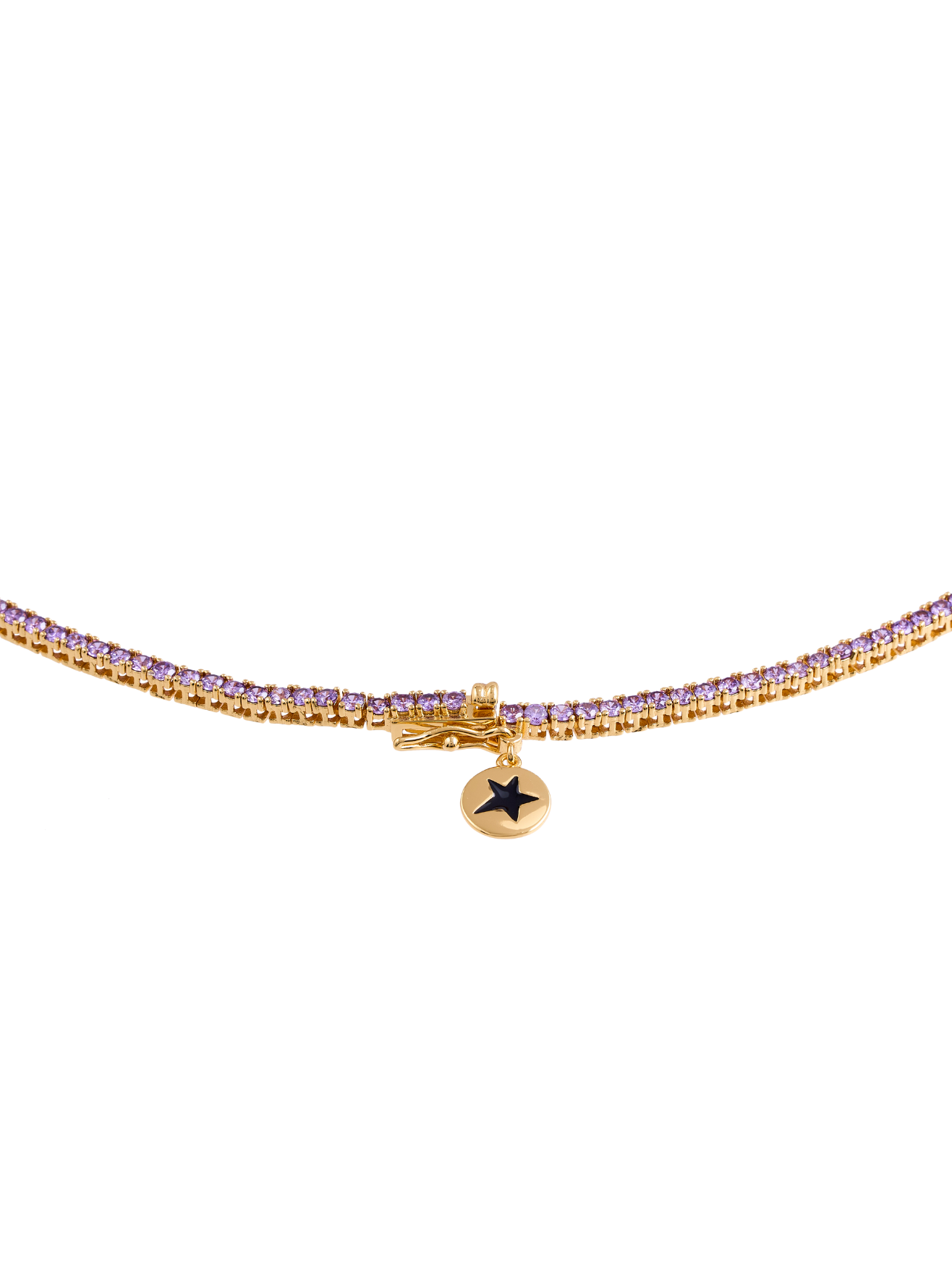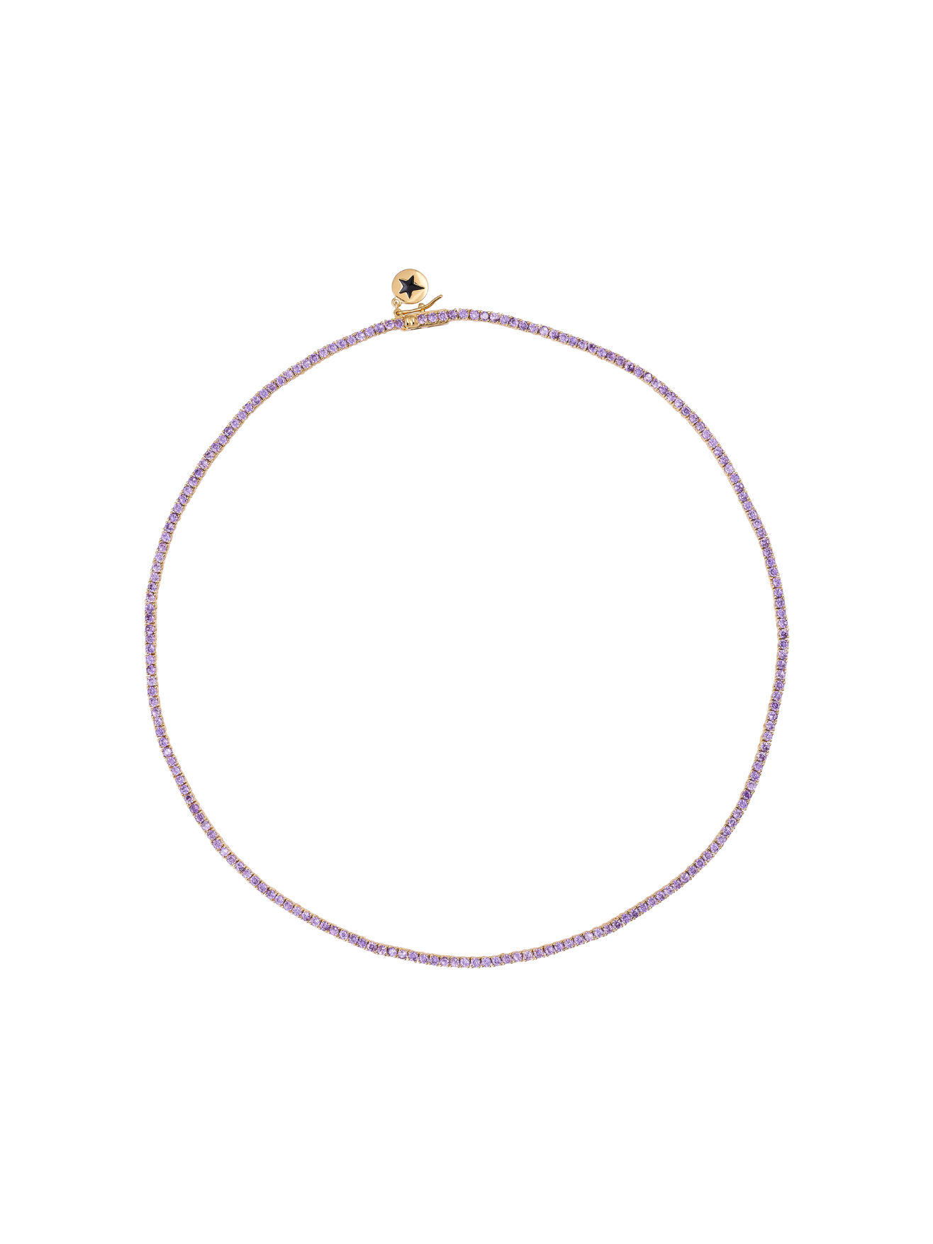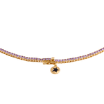 2mm tennis chain made of 24k gold-plated bronze and inlaid with amethyst-colored crystals.