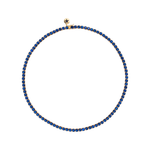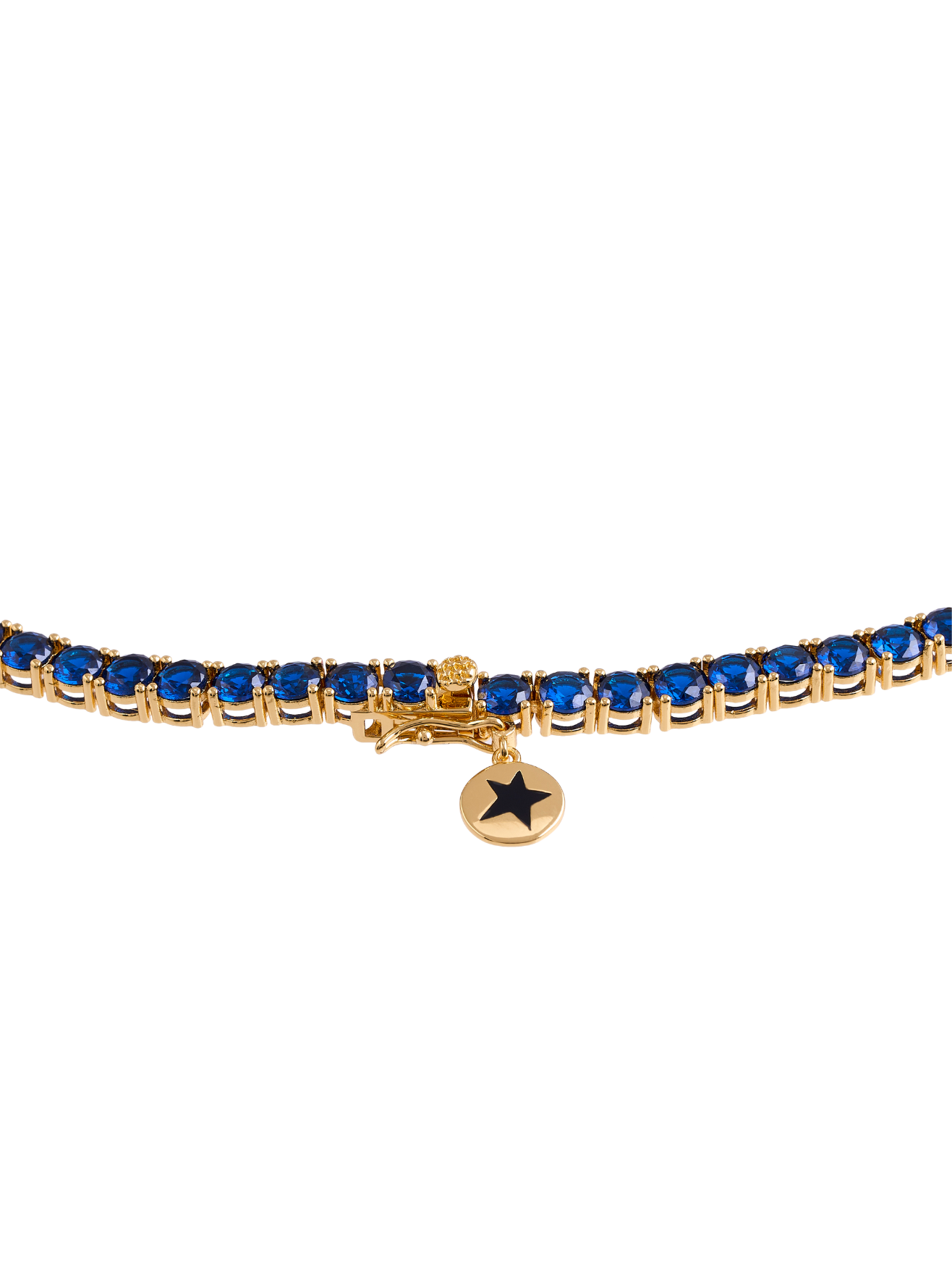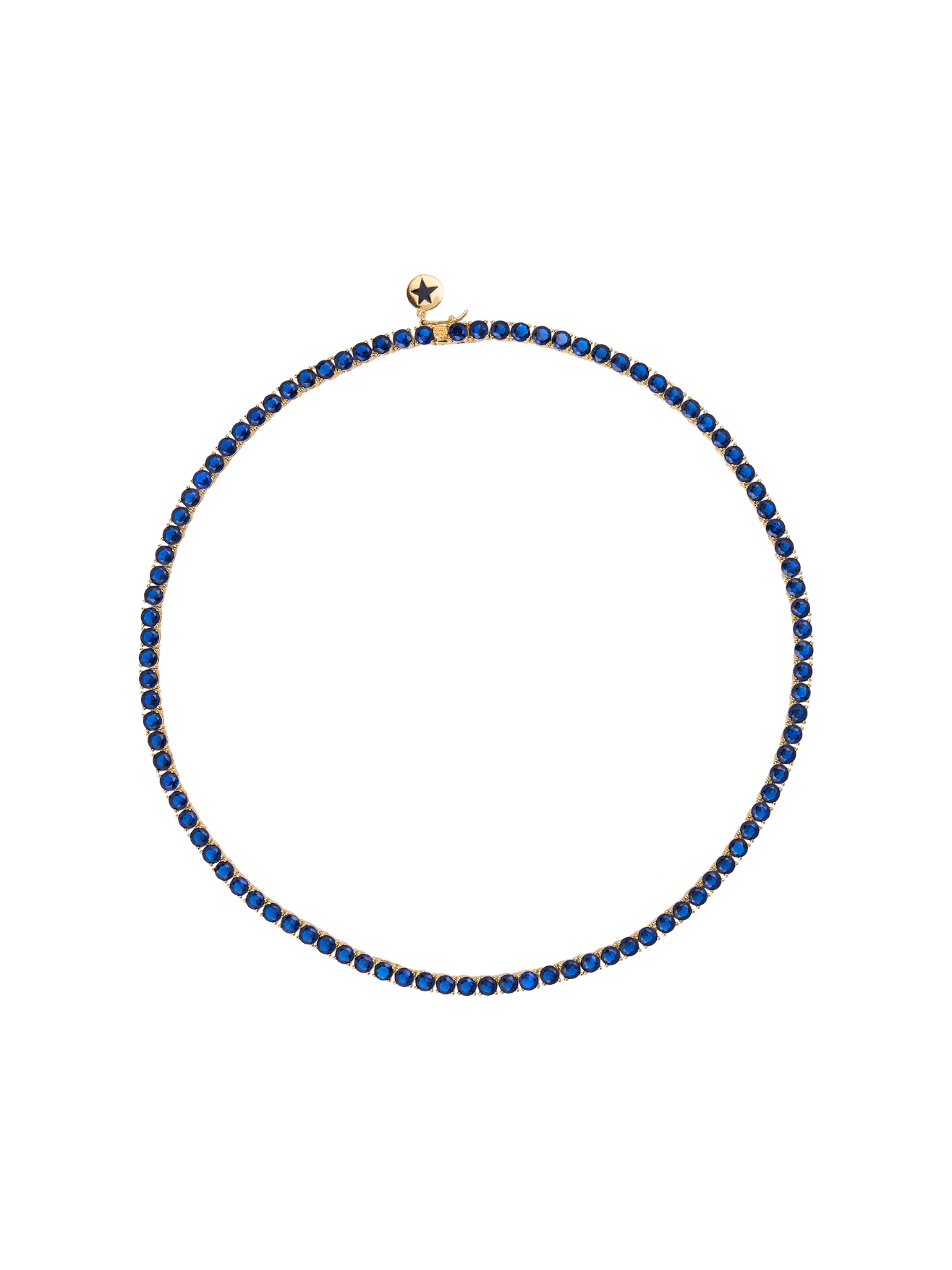 2mm tennis chain made of 24k gold-plated bronze and inlaid with sapphire-colored crystals.