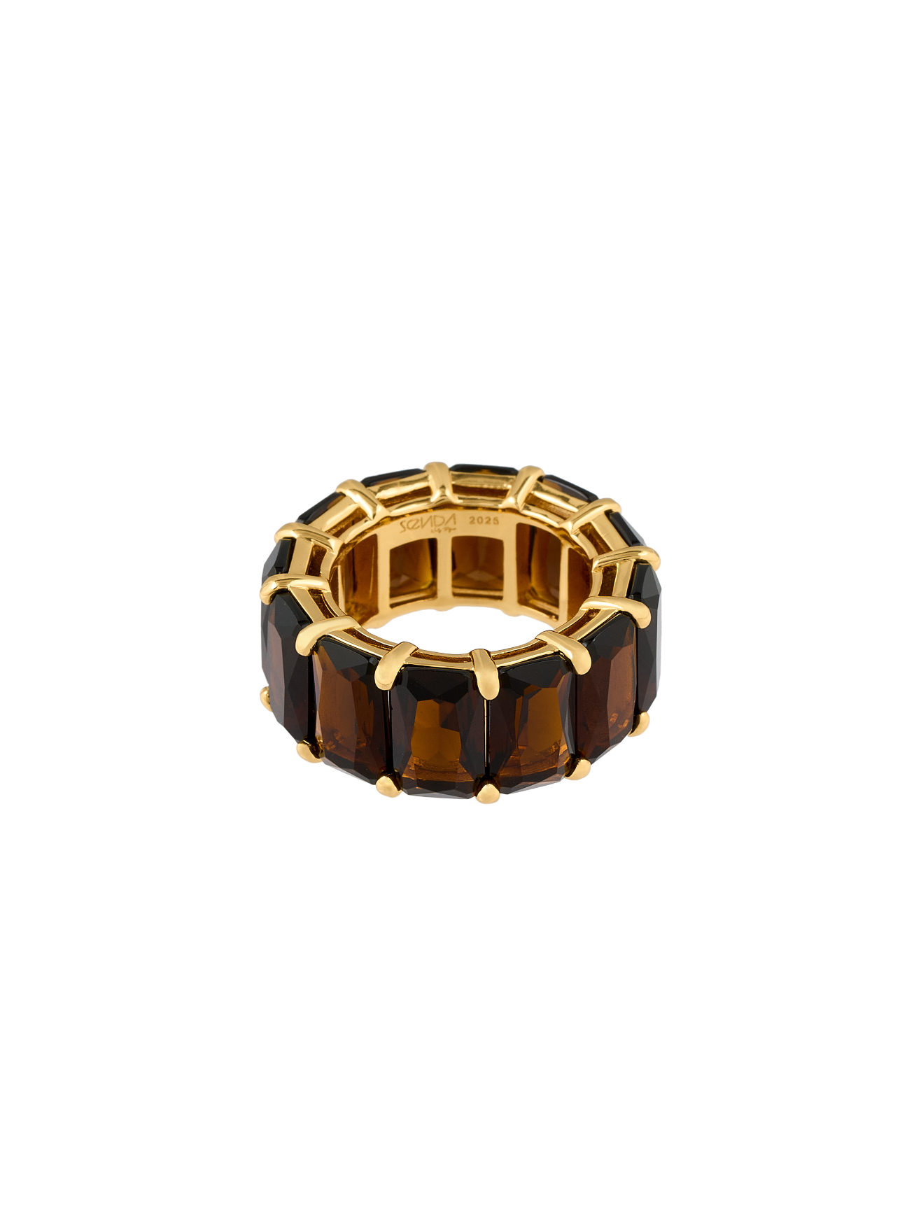 Esta versión actualizada de nuestro anillo más vendido -El Anillo Gran Baguette- ahora con cristales más anchos es una declaración de lujo moderno y elegancia atemporal. Protagonizado por delicados cristales facetados de corte geométrico en chocolate, cuidadosamente engastados en un diseño estructurado y contemporáneo envuelve el dedo con un brillo envolvente y una estética poderosa.