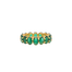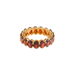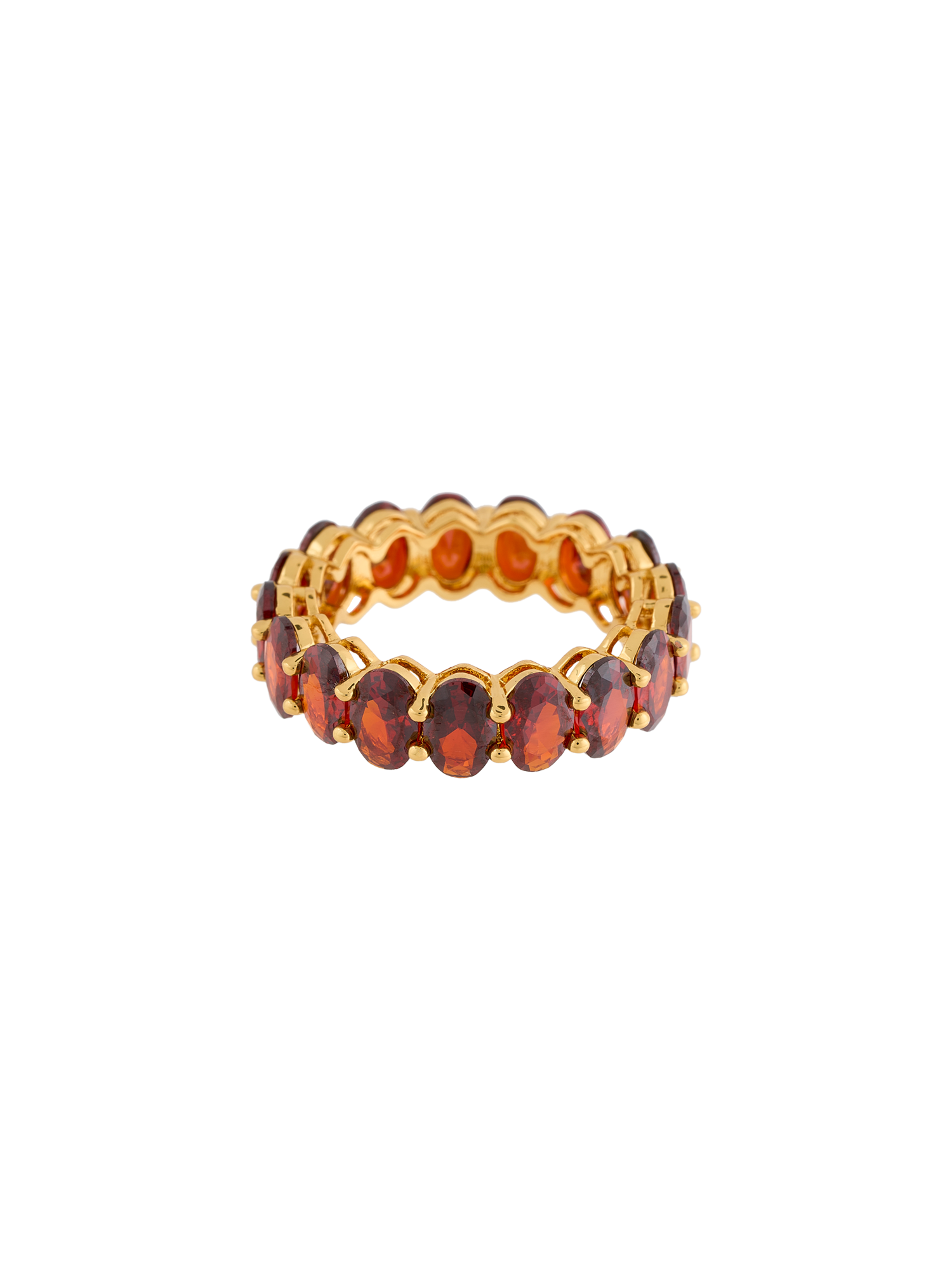 Anillo elaborado en bronce con baño de oro de 18 kilates, con incrustaciones de cristales con corte ovalado en tono granate.