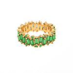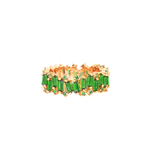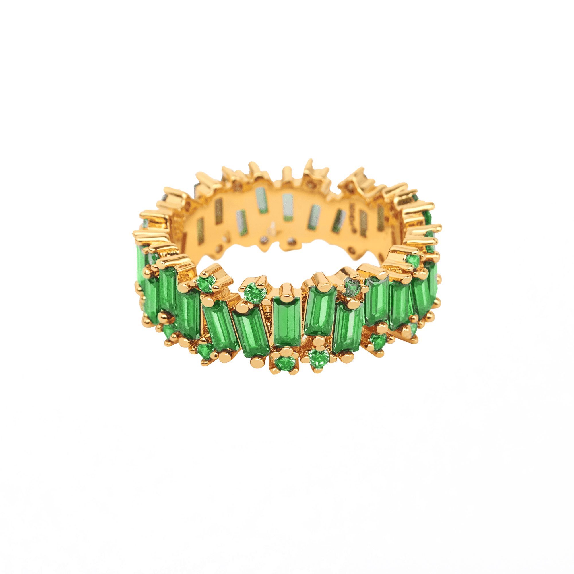 Elaborado en bronce con baño en oro de 18 kilates y adornado con incrustación de cristales tallados tipo baguette y redondos en tono esmeralda.