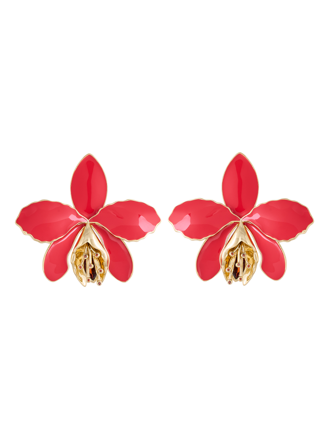 Celebra la belleza exquisita de la naturaleza con estos aretes inspirados en la delicadeza de la orquídea Cattleya. Cada pieza está cuidadosamente elaborada con pétalos esmaltados en un vibrante tono rojo carmesí, realzados por contornos en acabado dorado que aportan un toque radiante y sofisticado.