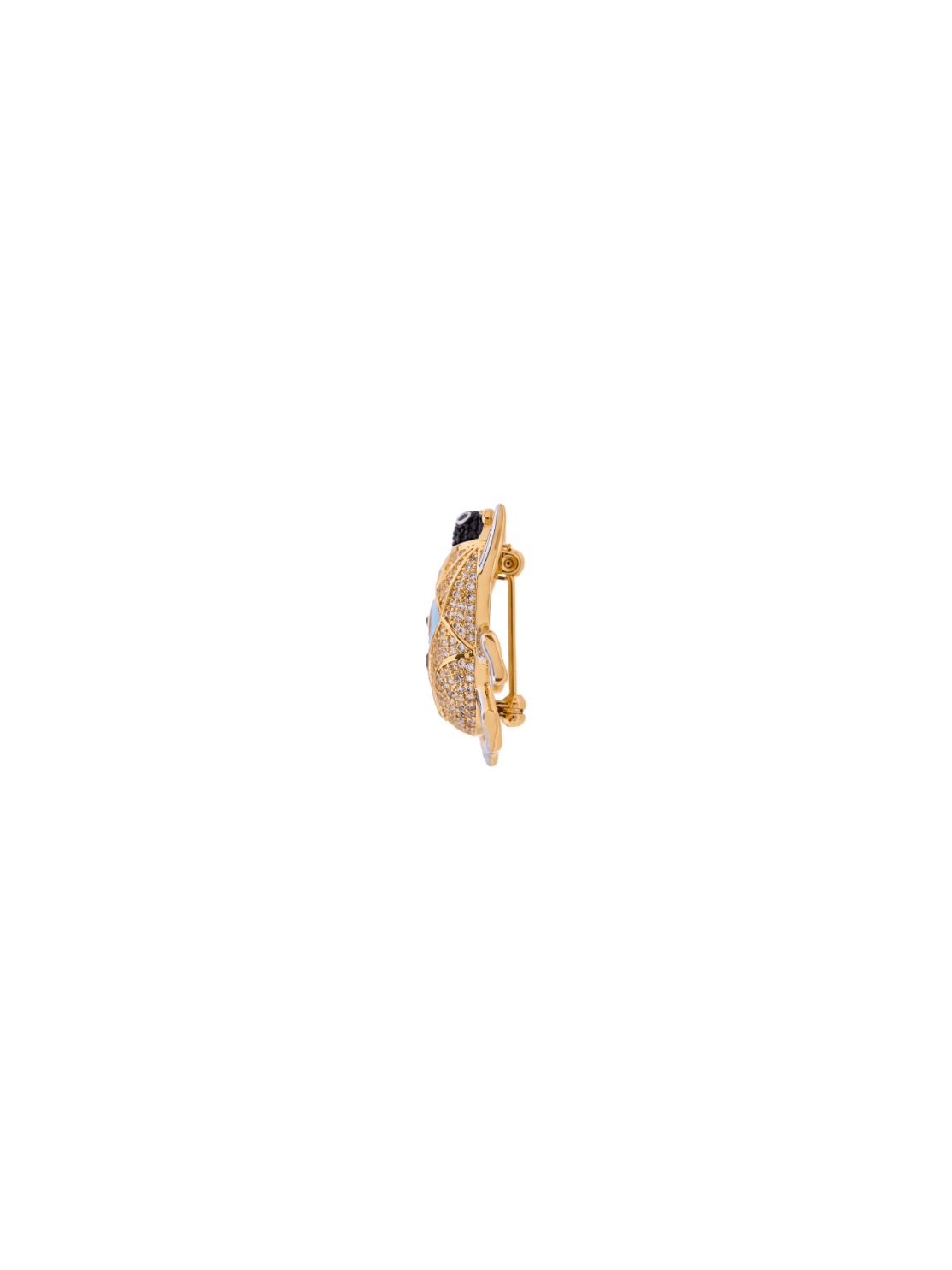 Un símbolo de transformación y protección convertido en joya, este broche escarabajo es una pieza audaz y llena de carácter. Elaborado en oro de 18 kilates, su cuerpo resplandece con un pavé de cristales blancos que contrastan con un impactante “ojo protector” en esmalte celeste y azul profundo, evocando intuición y poder espiritual.