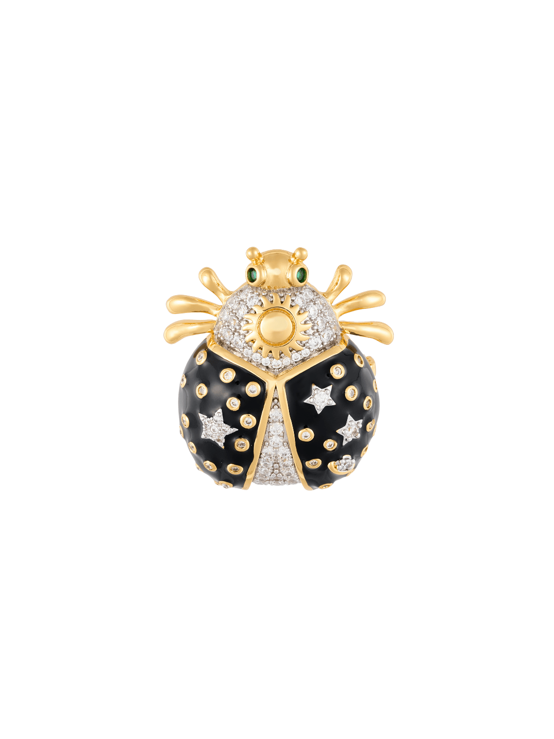 El Broche Royal Thot Onyx es una joya que fusiona la delicadeza del bronce con un magnífico baño de oro de 18 kilates y rodio blanco. Sus cristales translúcidos destellan su magia con la luz y los esmeralda aportan el equilibrio perfecto de color. Detalles de esmalte en un cautivador tono negro da un toque de elegancia y distinción.