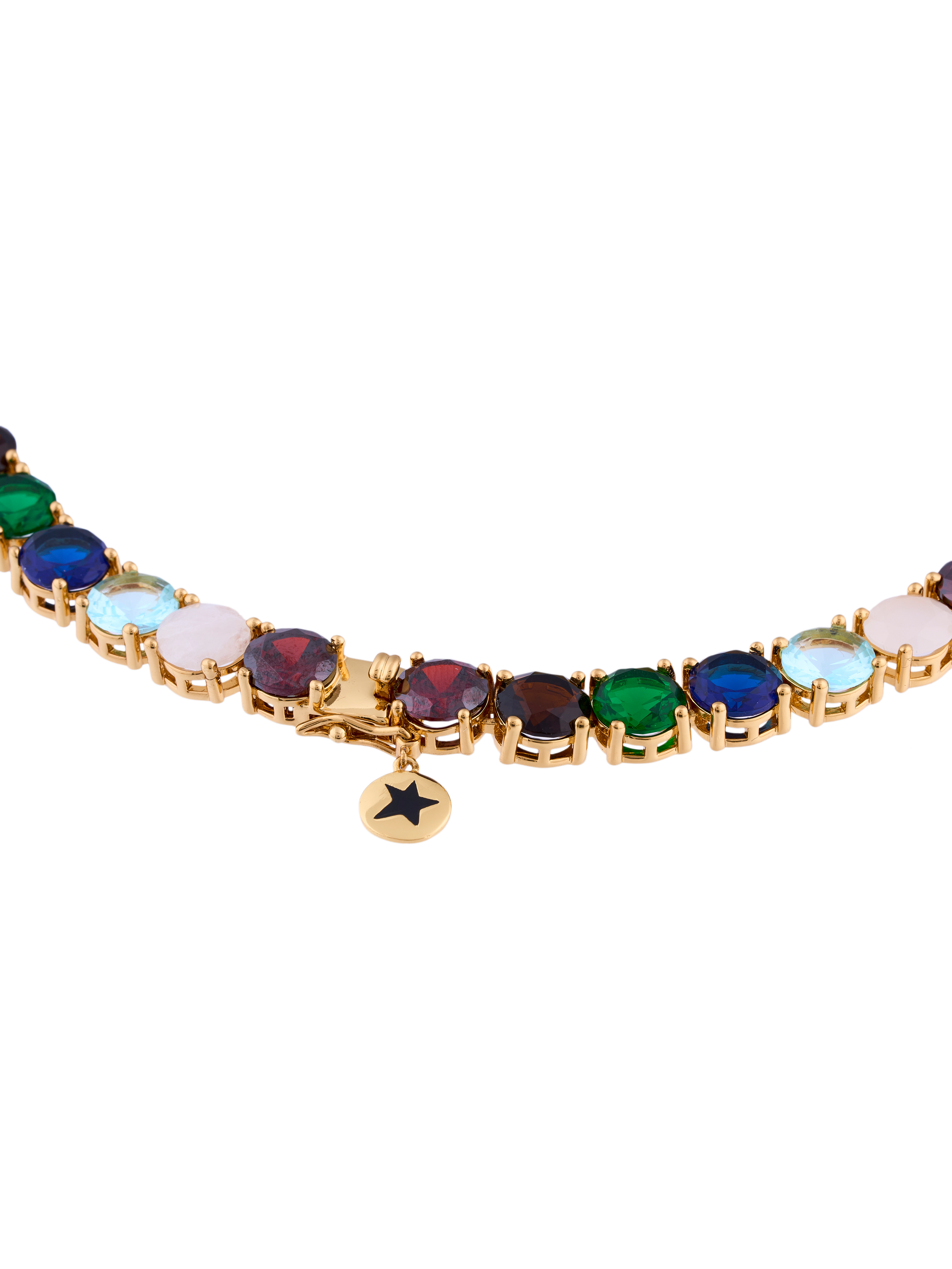 Elaborada en metal bronce, con baño en oro de 18 kilates y adornada con cristales facetados en tonos esmeralda, chocolate, granate, zafiro, topacio azul y cuarzo rosa.