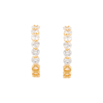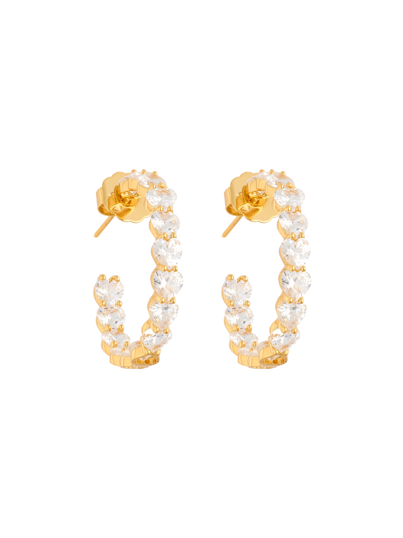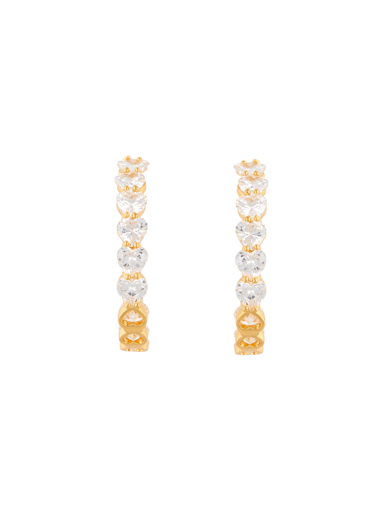 Cada candonga está cuidadosamente engastada con cristales facetados en forma de corazón que reflejan la luz desde todos los ángulos, creando un efecto de brillo elegante y envolvente. Su estructura dorada aporta calidez y lujo, mientras que el diseño semicircular estiliza el rostro con sutileza.