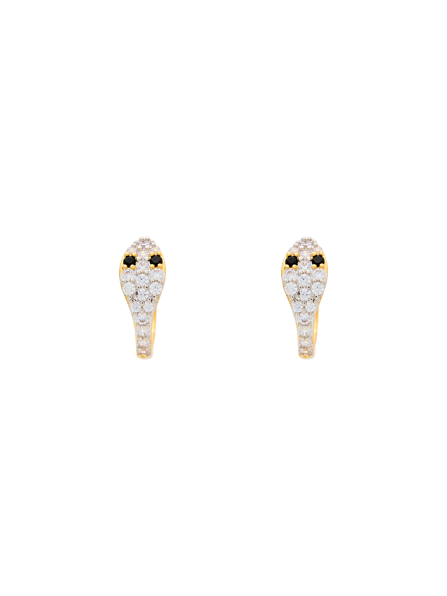 Mini candongas en forma de serpiente, elaboradas en metal bronce con baño en oro de 18 kilates y baño de rodio, adornadas con incrustaciones en pavé de microcristales en tono cristal con ojos en cristales facetados en tono onyx. Pines y mariposas en plata de ley 925.