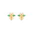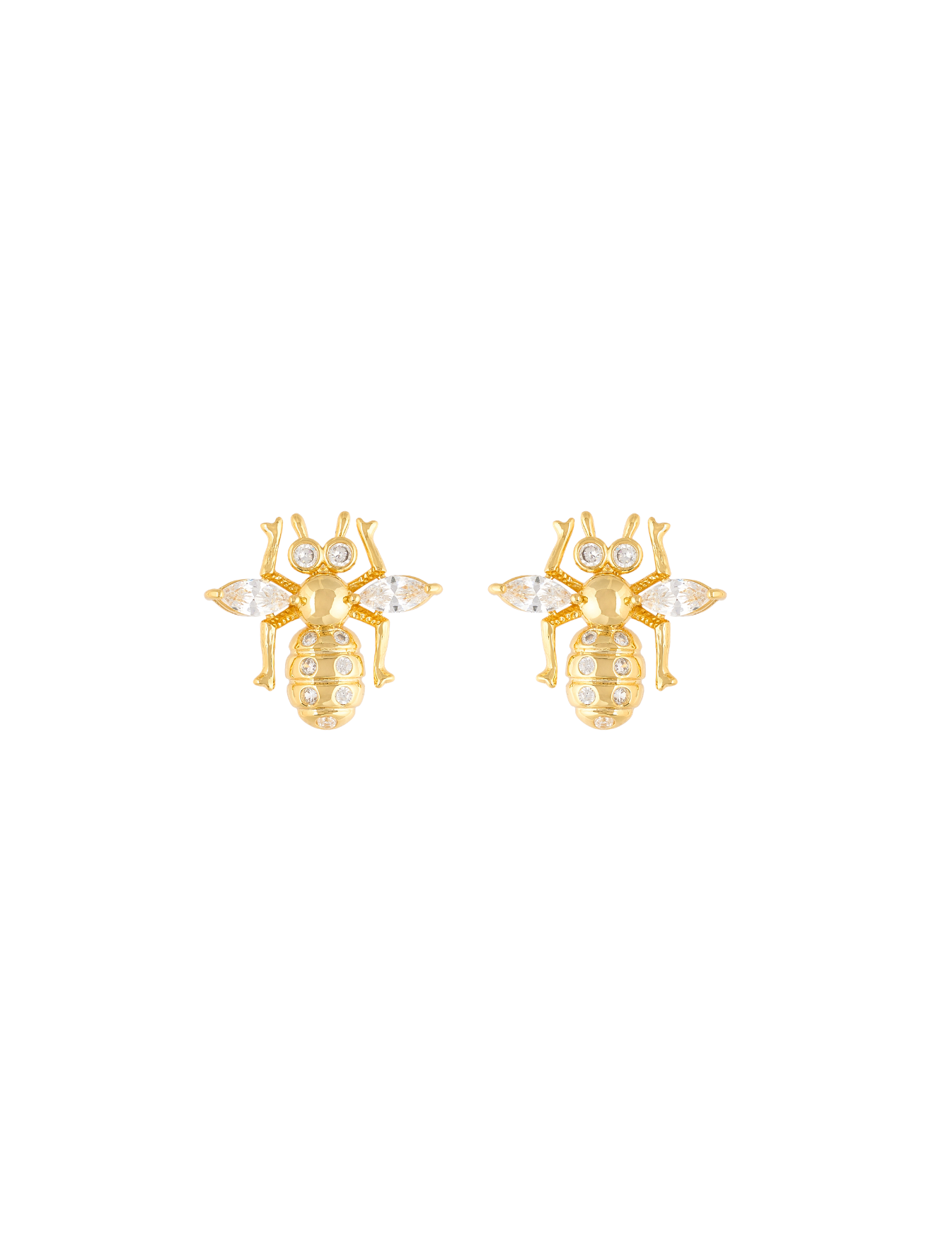 Elaborado en metal bronce con baño de oro de 18 kilates e incrustación de cristales facetados y microcristales en tono cristal. Pines y mariposas en plata de ley 925.
