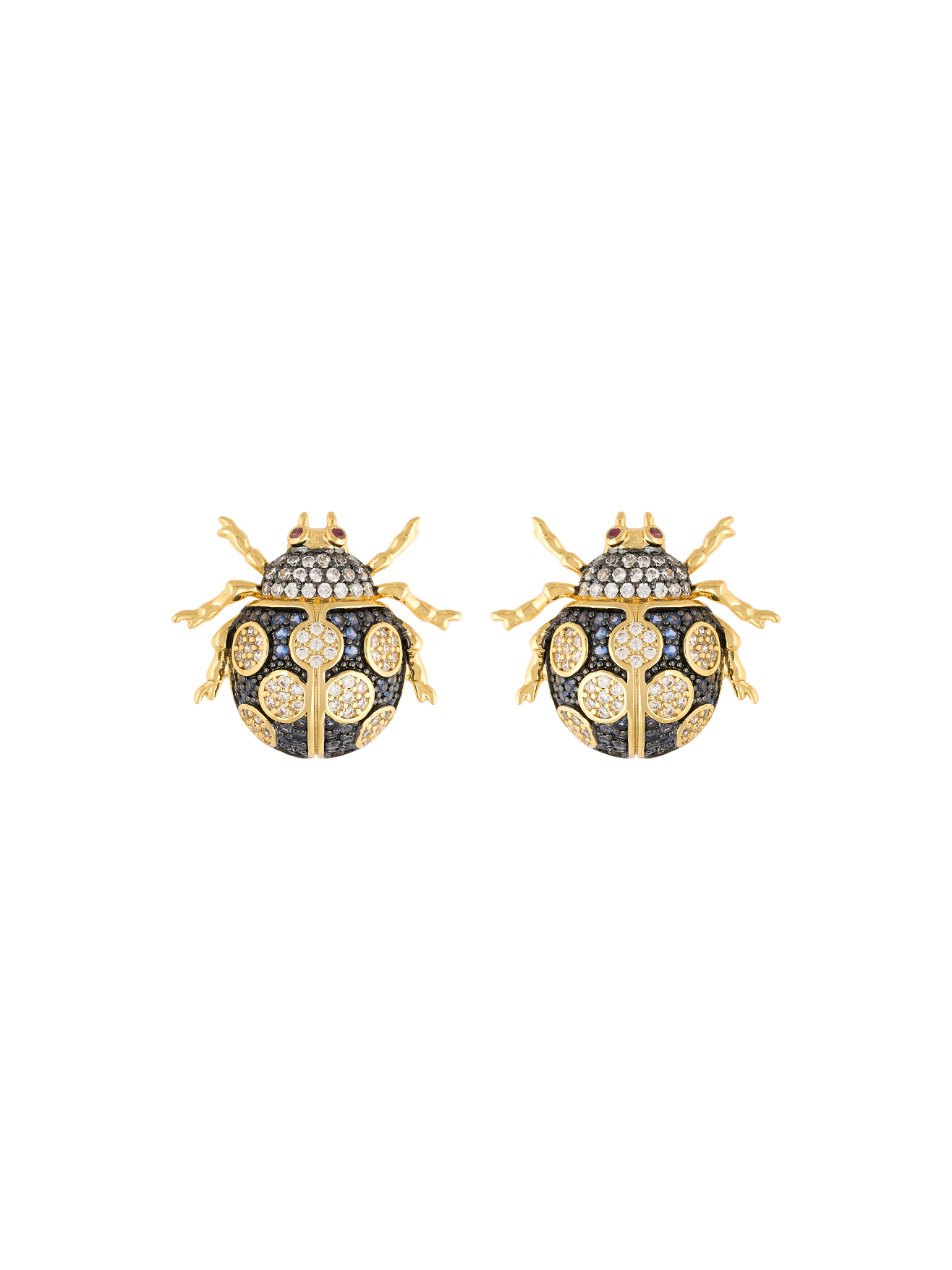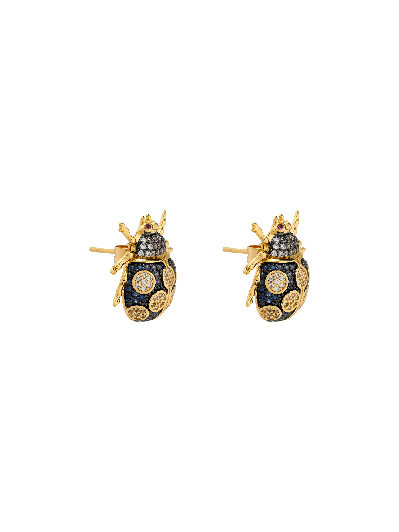 Los Topos Mini Escarabajo Fauna son una joya que evoca misterio, protección y poder ancestral. Estos aretes en forma de escarabajo adornados con microcristales en tono zafiro y cristal reinterpretan un símbolo histórico en una pieza de alta sofisticación.
